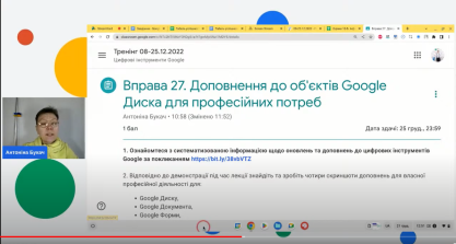 В ході тренінгу учасники дистанційно отримували завдання у захищених віртуальних навчальних кімнатах Google Класів, де було забезпечено ефективний зворотний зв’язок через супровід і консультації тренерів у приватних коментарях. До кожної теми публікувався запис лекції, організована додаткова консультація через відеоконференції в Google Meet, під час яких кожен учасник отримував можливість поставити запитання тренеру наживо, продемонструвати екран для вирішення проблемної ситуації.