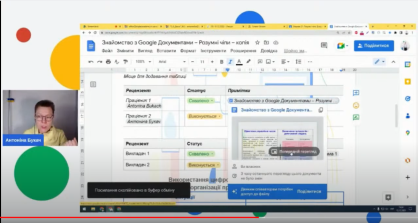 В цілому було опрацьована робота в таких додатках, як: Google Клас, Google Meet, Google Календар, Google Диск, Google Документи, Google Таблиці, Google Форми, Google Презентації, Google Keep, Google Сайти, Google Jamboard, Доповнення до об’єктів Google Диску, Google Chrome, ОС Chrome, Google Довідка, Google Центр безпеки, можливості Google Workspace for Education, матеріали навчальної платформи Skillshop.
