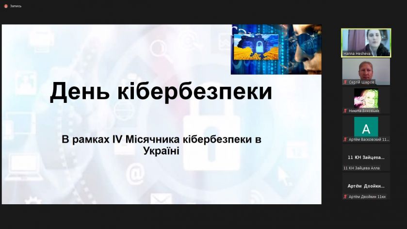 Захід до Дня кібербезпекиу режимі онлайн відбувся 27 жовтня на кураторській годині групи 11КН. Вступне слово взяв в.о. зав. кафедри комп’ютерних наук Сергій Шаров, який у передмові зазначив основні моменти, що стосуються значення інформаційної безпеки для громадян, підприємств, країни в цілому.