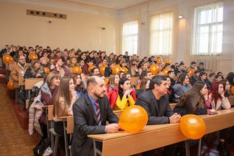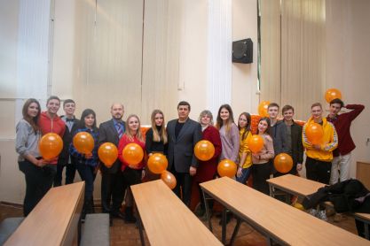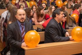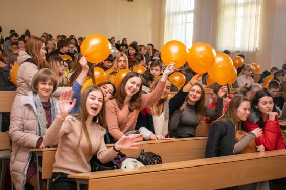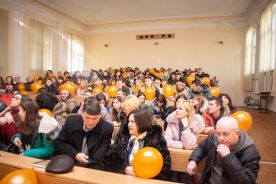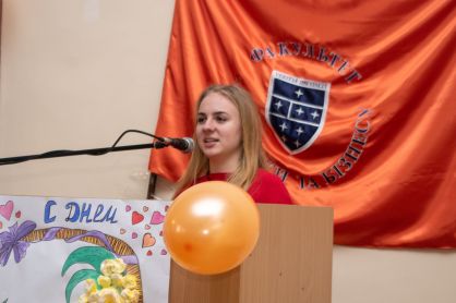 Винуватців свята та його гостей зустріла аудиторія великого конференц-залу університету, яка була прикрашена яскравими білими та помаранчевими кульками – кольорами факультету, а також цікавими привітальними газетами, яку зробили студенти академічних груп факультету власними руками.
