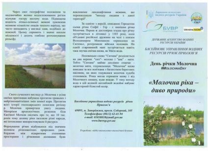 З метою привернення уваги суспільства до питань використання водних ресурсів в Україні щорічно проводиться низка екологічних заходів. У рамках басейнового підходу до водних ресурсів Приазовського регіону, 21 вересня вперше було проведено еколого-просвітницький захід «День річки Молочна»!