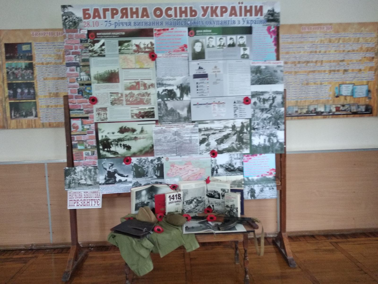 До 75-річчя вигнання нацистських окупантів із України, безсмертному подвигу, ратній та трудовій звитязі українського народу у роки Другої світової війни, наукова бібліотека підготувала стендову виставку-інсталяцію «Багряна осінь України», де представлені документальні матеріали та світлини подій Другої світової війни. Виставка демонструється у головному корпусі університету.