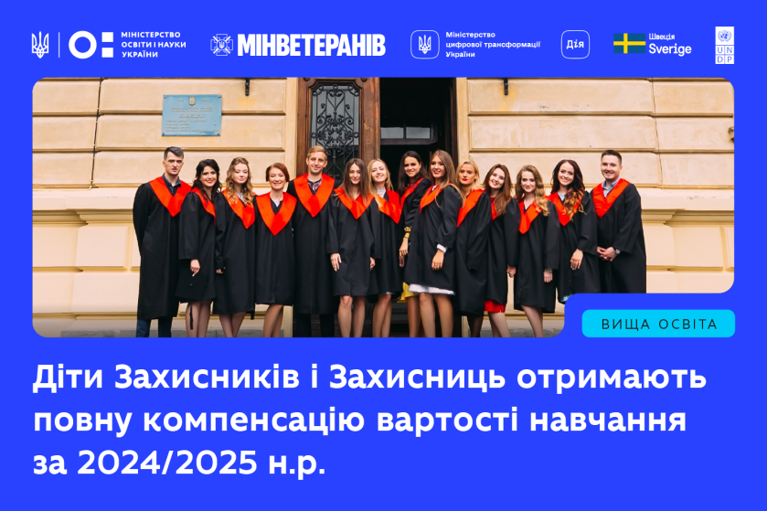 Міністерство освіти і науки України інформує: за 2024/2025 навчальний рік держава, а саме Міністерство у справах ветеранів України, надасть повну компенсацію вартості контрактного навчання для понад 13 тисяч студентів з-поміж дітей захисників і захисниць.
