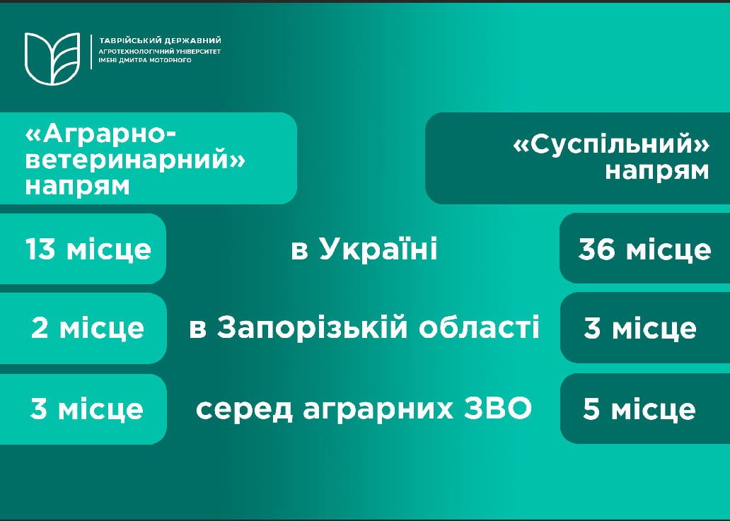 За результатами державної атестації ТДАТУ за напрямом «аграрно-ветеринарний» посів 13 місце в Україні