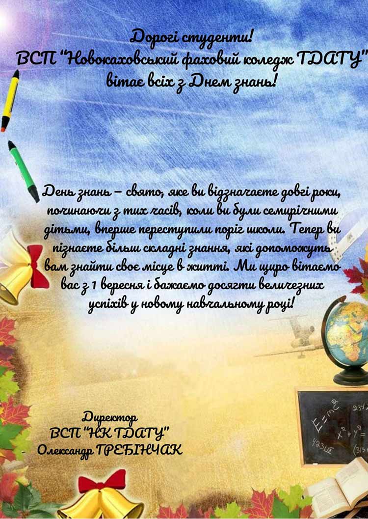 Вітаю всіх з Днем знань! Бажаю, щоб наші студенти з великою радістю йшли за знаннями до нашого коледжу і з задоволенням опановували знання і вміння!