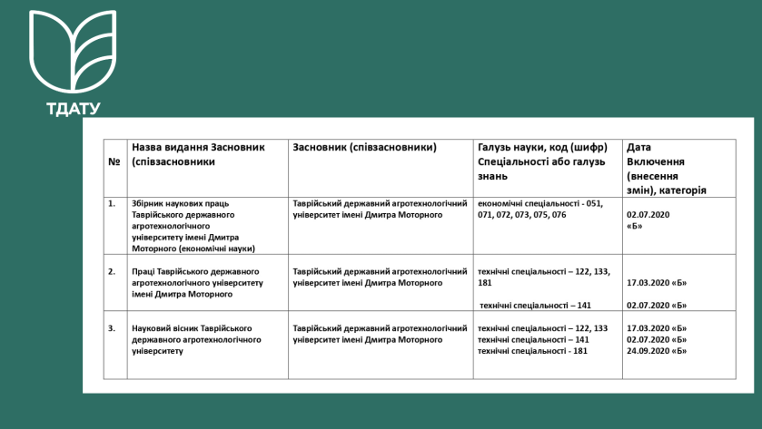 Наукові фахові видання ТДАТУ наразі входять до Переліку.. в категорії “Б”.