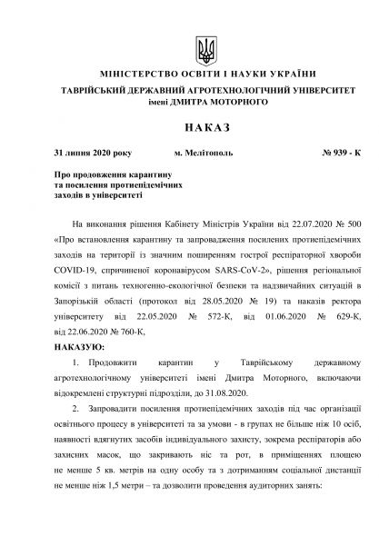 У зв’язку з пандемією на COVID-19, керівництво Таврійського державного агротехнологічного університету імені Дмитра Моторного опублікувало наказ №939 – К «Про продовження карантину та посилення протиепідемічних заходів в університеті».