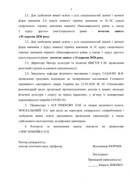 Зокрема, у документі вказано про посилення протиепідемічних заходів під час організації освітнього процесу в університеті та за умови – в групах не більше ніж 10 осіб, наявності вдягнутих засобів індивідуального захисту: респіраторів або захисних масок, що закривають ніс та рот, в приміщеннях площею не менше 5 кв. метрів на одну особу та з дотриманням соціальної дистанції, не менше ніж 1,5 метри – та дозволити проведення аудиторних занять.