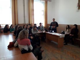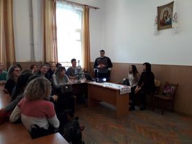 На запрошення викладачів кафедри суспільно-гуманітарних наук до студентів нашого університету на зустріч завітав священик української греко-католицької церкви отець Олександр Богомаз, під час якої досить цікаво та емоційно розповів про традиції святкування Різдва в Україні. Також отець Олександр презентував унікальний проект – «Різдво разом», під час якого молодь із різних куточків нашої країни зустріне це свято у Мелітополі. Свято буде відбуватися протягом 4-8 січня. Тож отець Олександр запросив нашу молодь долучитися до святкування та розділити радість одного із головних християнських свят через українські традиції вертепу, колядок, свят-вечері та різноманітних майстер-класів. Адже молодь сьогодні – це рушійна сила в розбудові нашої держави, тому так важливо, щоб під час таких заходів наші юнаки та дівчата показали, що вони виступають за єдність та неподільність України.