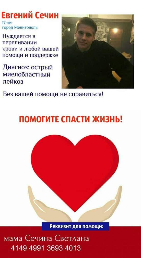 Євгену Сєчіну, студенту ВСП «Мелітопольський фаховий коледж ТДАТУ», який бореться з раком крові, дуже потрібні донори крові на плазму будь-якої групи.