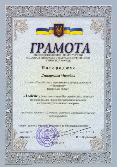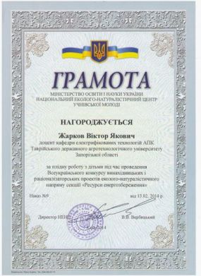 Також нагороджений грамотою Жарков Віктор Якович, доцент кафедри електрифікованих технологій АПК ТДАТУ за плідну роботу з дітьми під час проведення Всеукраїнського конкурсу винахідницьких та раціоналізаторських проектів еколого-натуралістичного напряму секції «Ресурси енергозбереження».