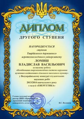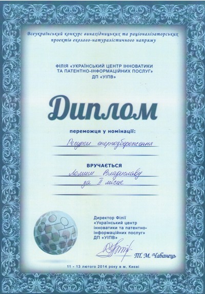 У Всеукраїнському конкурсі студентських наукових робіт 2013-2014 н.р. у галузі «Енергетика» Ломиш Владислав нагороджений дипломом ІІ ступеню.