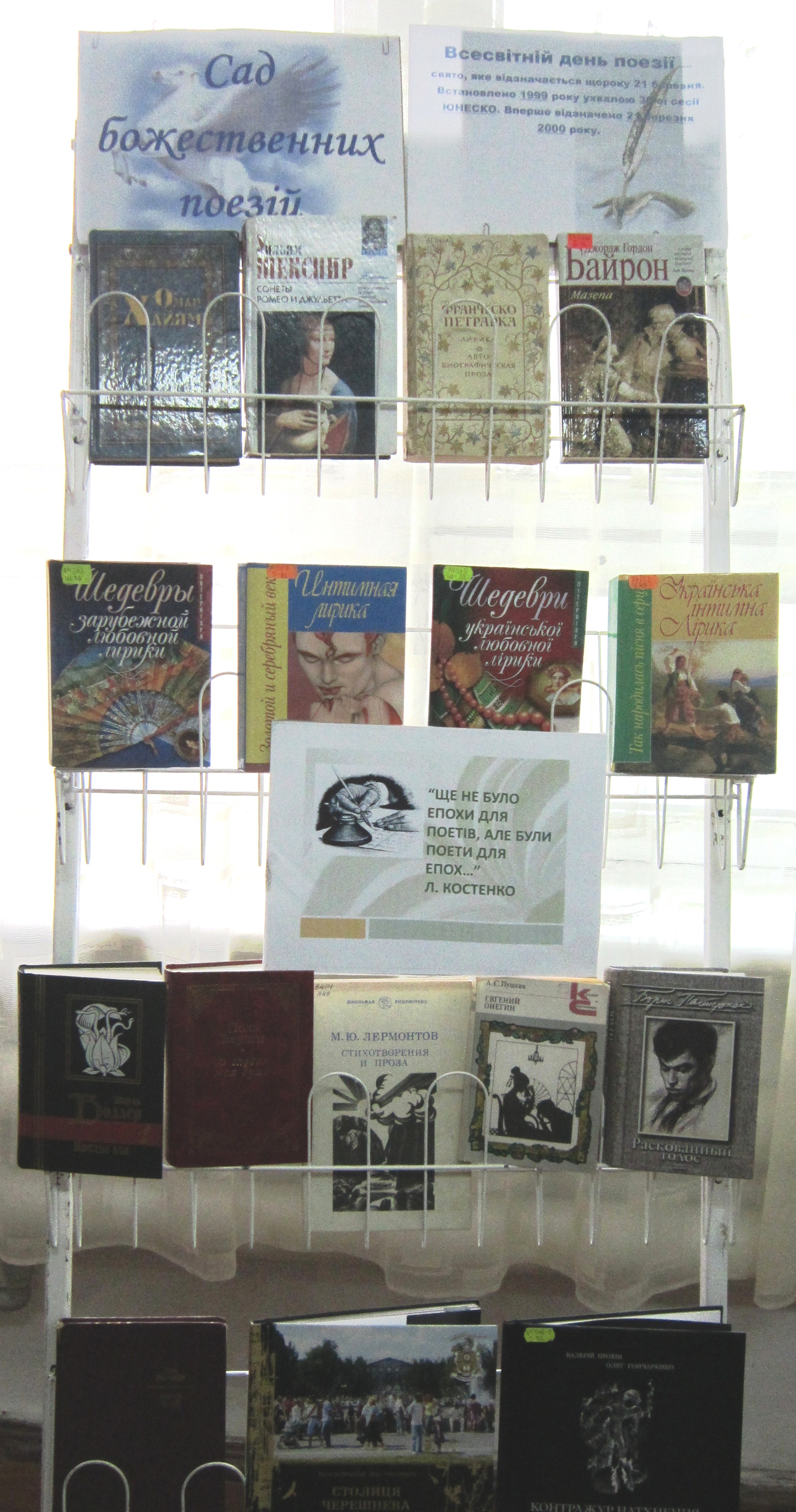 Наукова бібліотека має багатий фонд поетичної літератури. На виставці представлені твори О. Хаяма, У. Шекспіра, Ф. Петрарки, Л. Костенко; твори мелітопольських поетів – О. Гончаренко, О. Дунаєвої, В. Ломако; поетичні збірки «Контражур натхнення», «Столиця черешнева столиця».