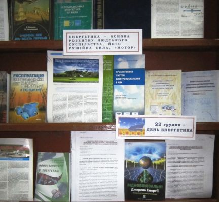 До Дня енергетика наукова бібліотека підготувала тематичну виставку «Енергетична стратегія України», яка демонструється на першому поверсі бібліотеки.