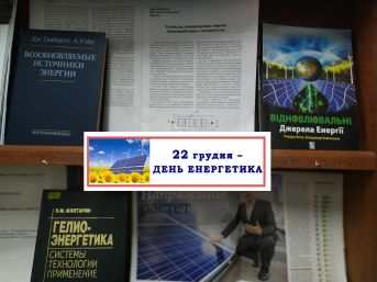 Щороку 22 грудня Україна святкує День енергетика. З цієї нагоди наукова бібліотека підготувала тематичну виставку «Відновлювальна енергетика». На виставці представлені фахові, науково популярні, науково-виробничі періодичні видання: «Аграрний тиждень», «Винахідник і раціоналізатор», «Біоенергетика», «Енергетика та електрифікація», «Промелектро», «Новое время страны», газета «Агробізнес сьогодні», навчальні видання науковців нашого університету, науково-популярні видання, монографії, в яких висвітлюються пріоритети розвитку нетрадиційної, відновлювальної та біоенергетики.