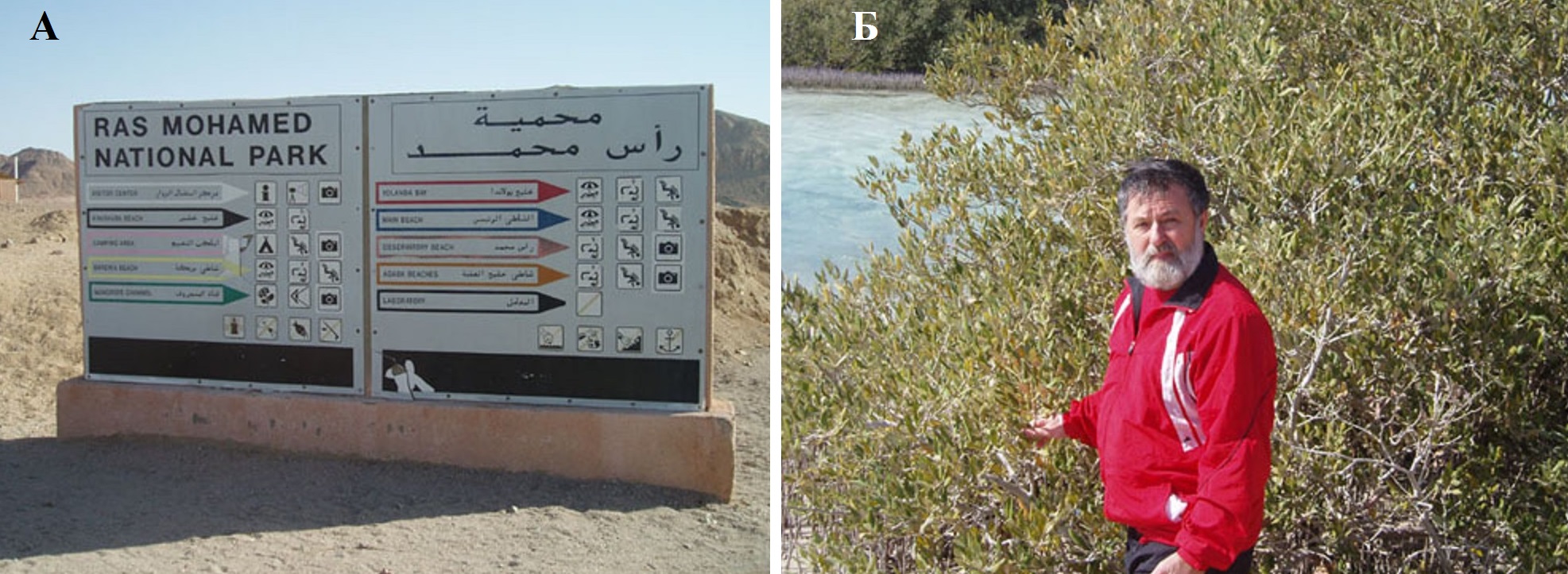 Рис. 1 В`їзд до НП «Рас Мохаммед» (А); мангри: авіценнія морська (Б)