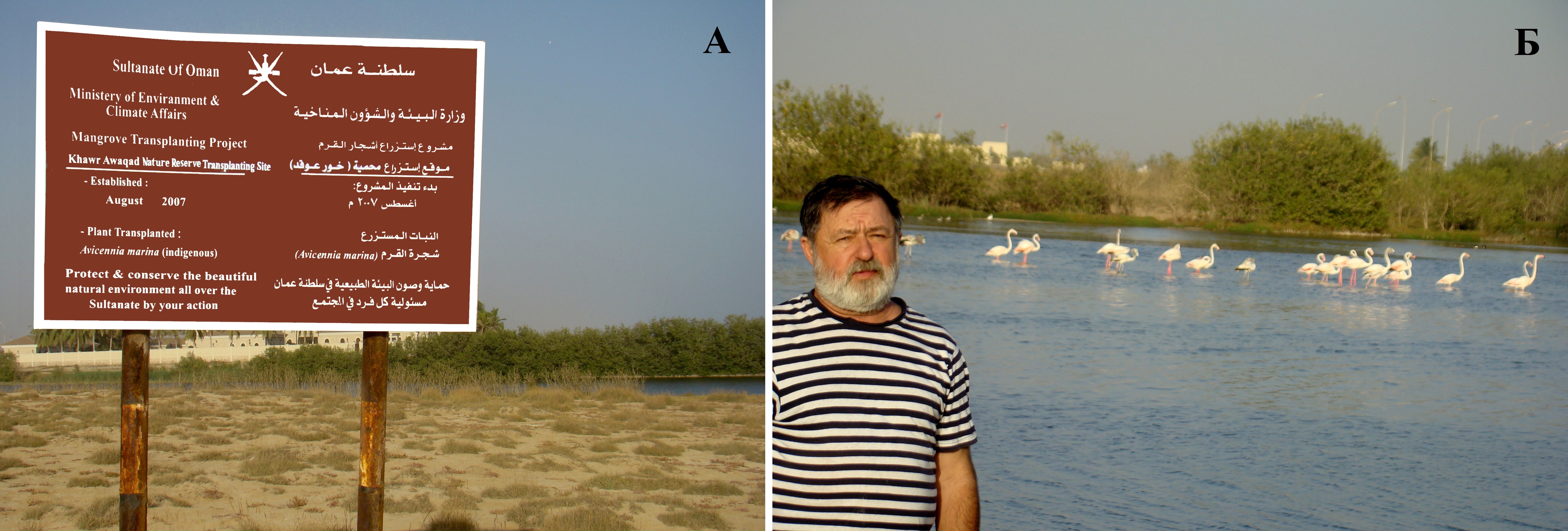Рис. 10 Резерват морської авіценії (А); фламінго на його території (Б)