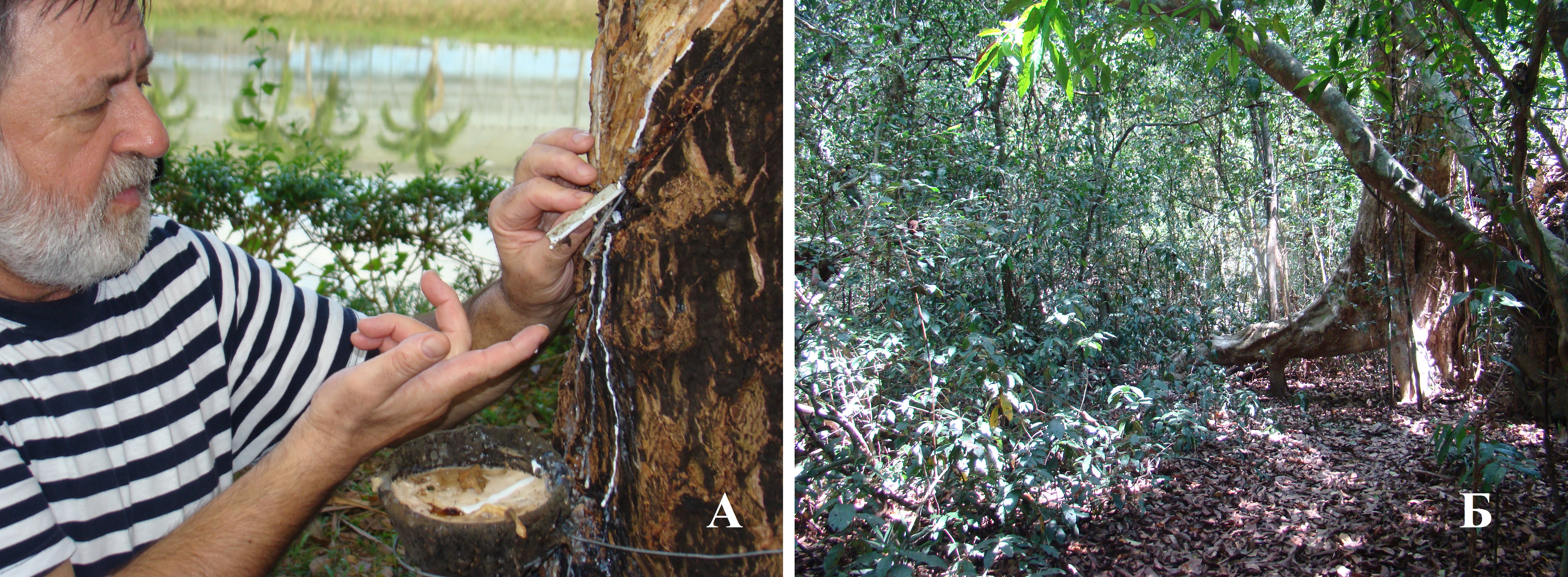 Рис. 4 Отримання каучуку із гевеї (А); дощовий тропічний ліс (Б)