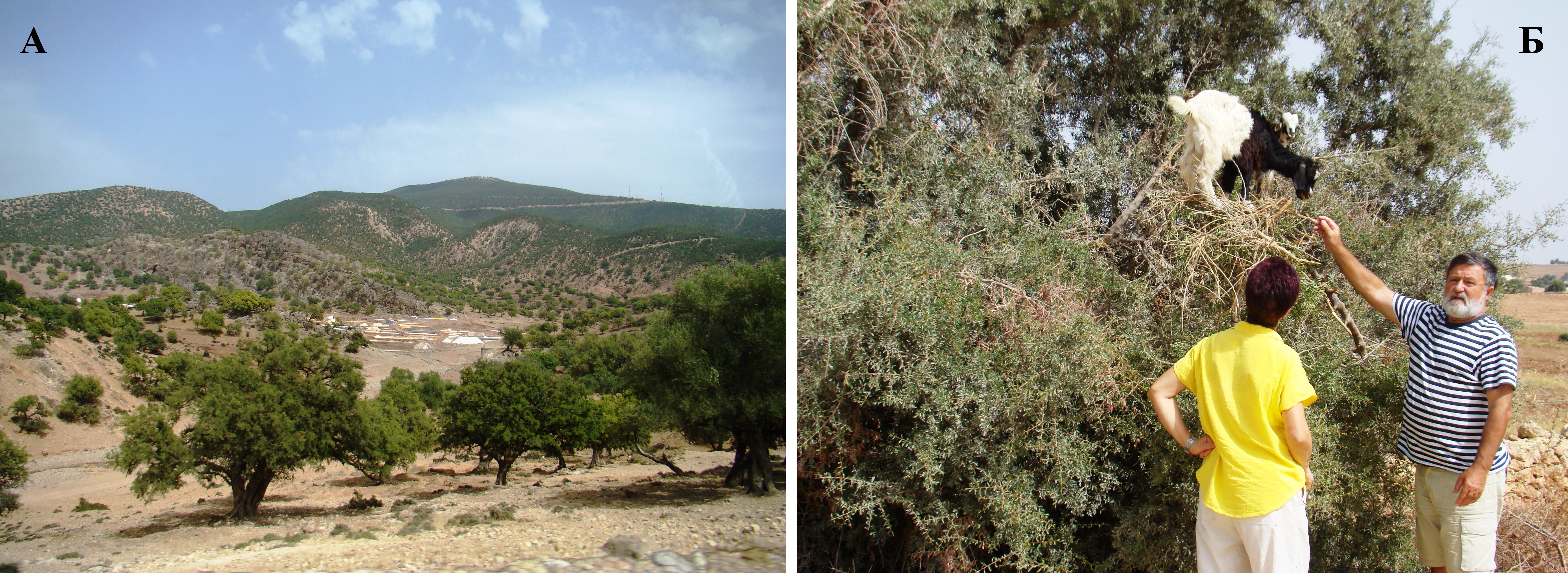 Рис. 6 Середземноморські ліси Марокко (А); кози на агранових деревах (Б)