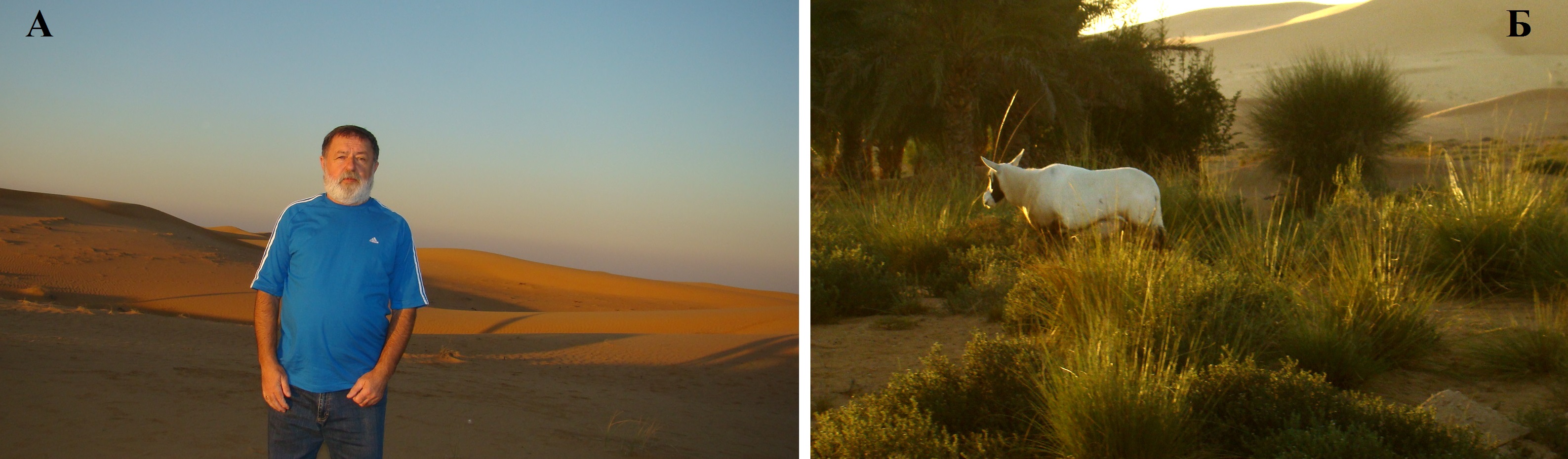 Рис. 7 В пустелі Руб-ель-Халі (А); рідкісний арабський орикс (Б)