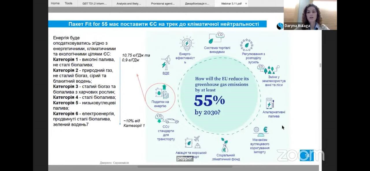 123Начальниця відділу управління викидами НАК “Нафтогаз України”. Дарина Кулага ознайомила присутніх з глобальною проблематикою змін клімату, декарбонізації, підтримкою низьковуглецевого бізнесу. Політика ЄС переважно зорієнтована на зниження користування електроенергії та зменшення кількості викидів, що задокументовано на законодавчому рівні. Основна стратегія зеленого курсу ЄС спрямована на відмову від російських енергоресурсів.