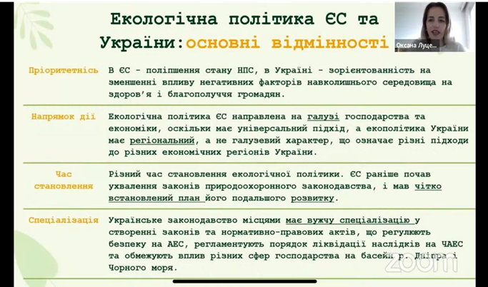 Кскрін 1оординаторка Партнерства “Green Business Ukraine” Оксана Луценко, розгорнуто представила тему “зеленого” відновлення України та екологічною політикою ЄС. На сьогодні екологічна політика ЄС націлена на поліпшення стану навколишнього природного середовища, а в Україні орієнтована на зменшення впливу негативних факторів навколишнього середовища на здоров’я і благополуччя громадян. ЄС має більш чіткий план розвитку та його дотримання, але українське законодавство має вужчу спеціалізацію у створенні законодавчої бази з питань екологічної безпеки, проте не завжди ефектно виконується.