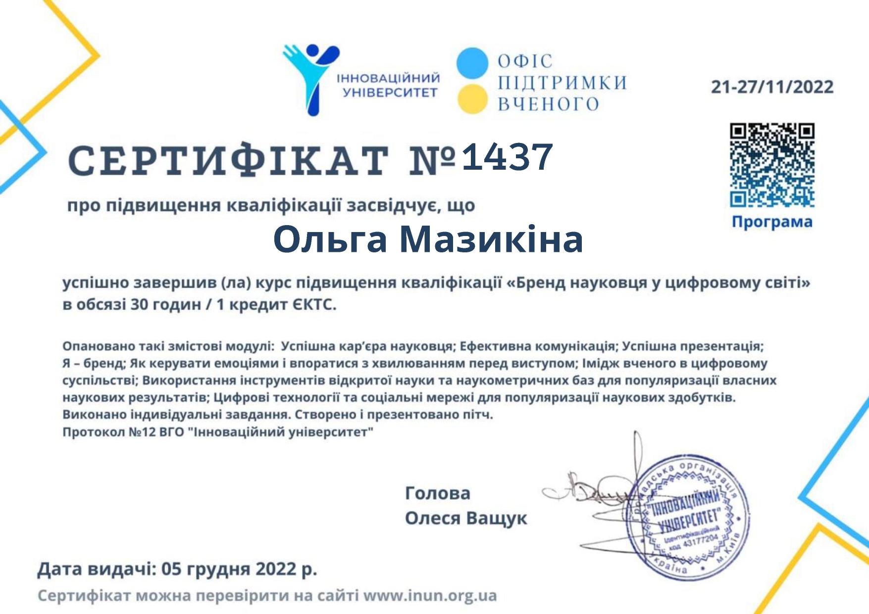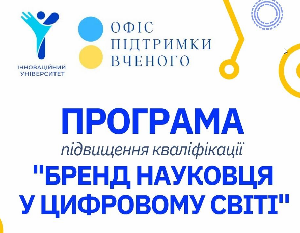 Викладачі кафедри ГЕЗ Ольга Мазикіна та Вікторія Скиба мали змогу долучитись до дуже цікавого курсу підвищення кваліфікації «Бренд науковця у цифровому світі», організованого Інноваційним Університетом спільно з Офісом підтримки вченого, який проходив упродовж 21-27 листопада 2022 року.Курс складався з наступних модулів, які були націлені на продуктивне формування компетентностей та навичок сучасного викладача в дуже динамічному та мінливому світі: