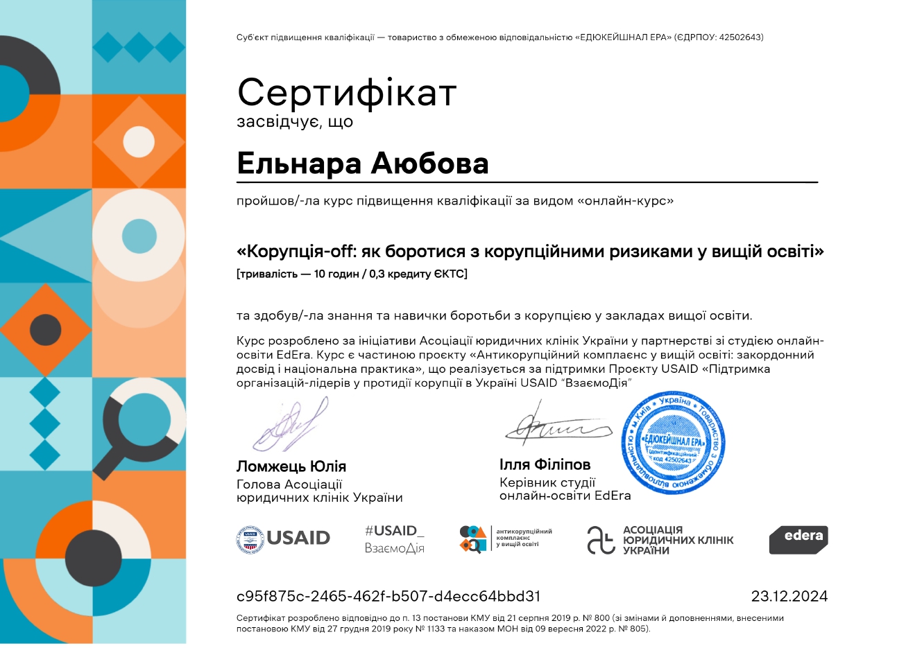 Курс розроблено за ініціативи Асоціації юридичних клінік України у партнерстві зі студією онлайн-освіти EdEra. Курс є частиною проєкту « Антикорупційний комплаєнс у вищій освіті: закордонний досвід і національна практика», що реалізується за підтримки Проєкту USAID «Підтримка