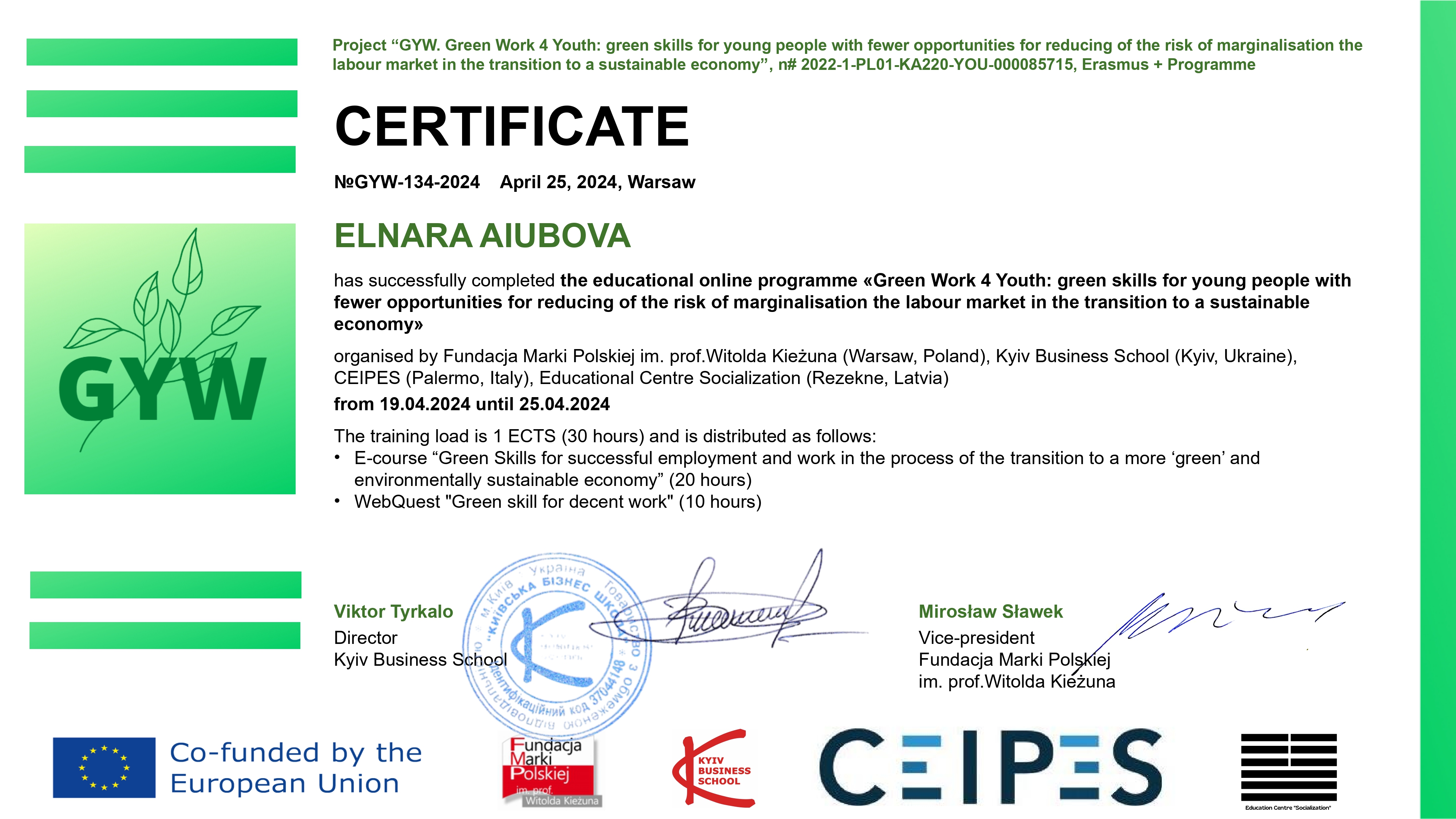 GYW. Green Work 4 Youth: green skills for young people with fewer opportunities for reducing of the risk of marginalisation the labour market in the transition to a sustainable economy» за підтримки програми Erasmus+ |