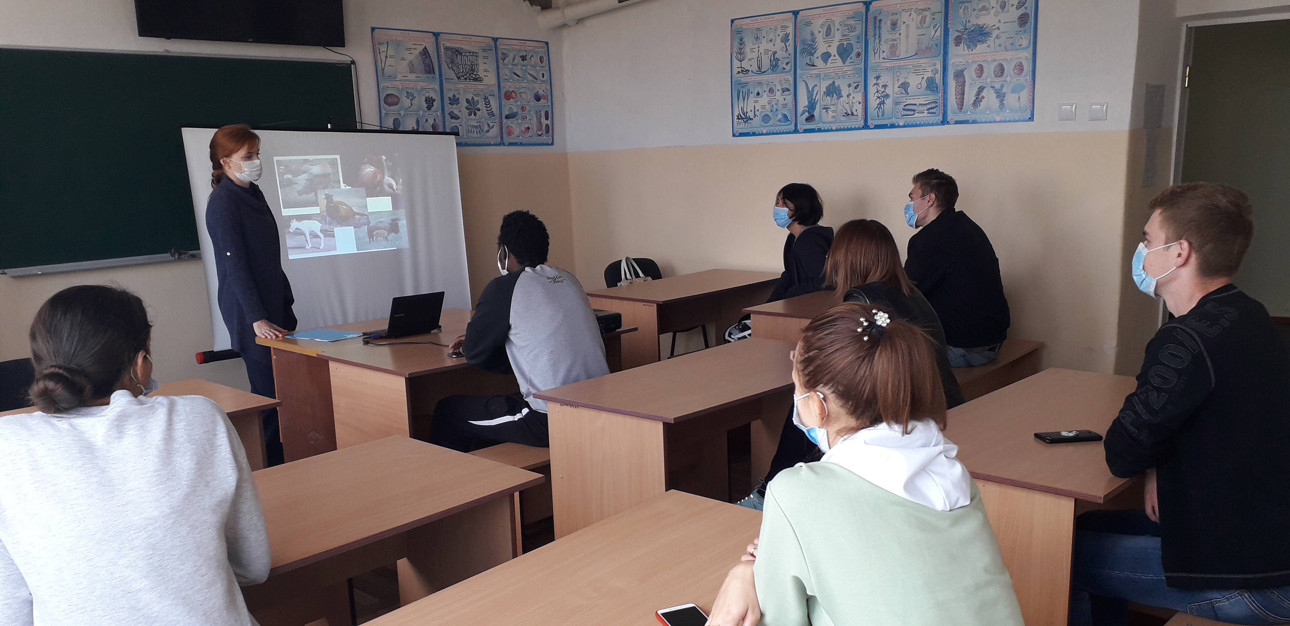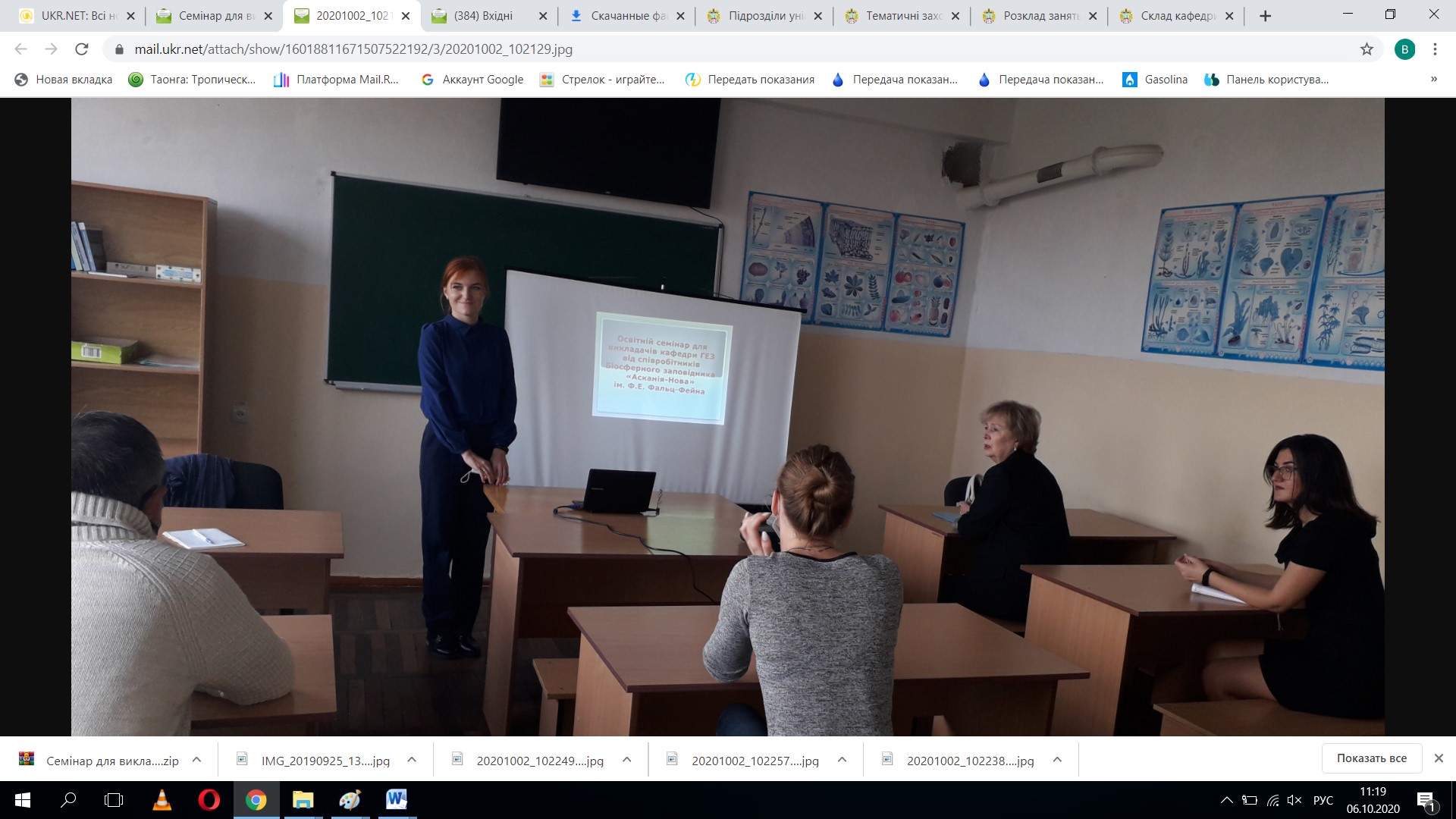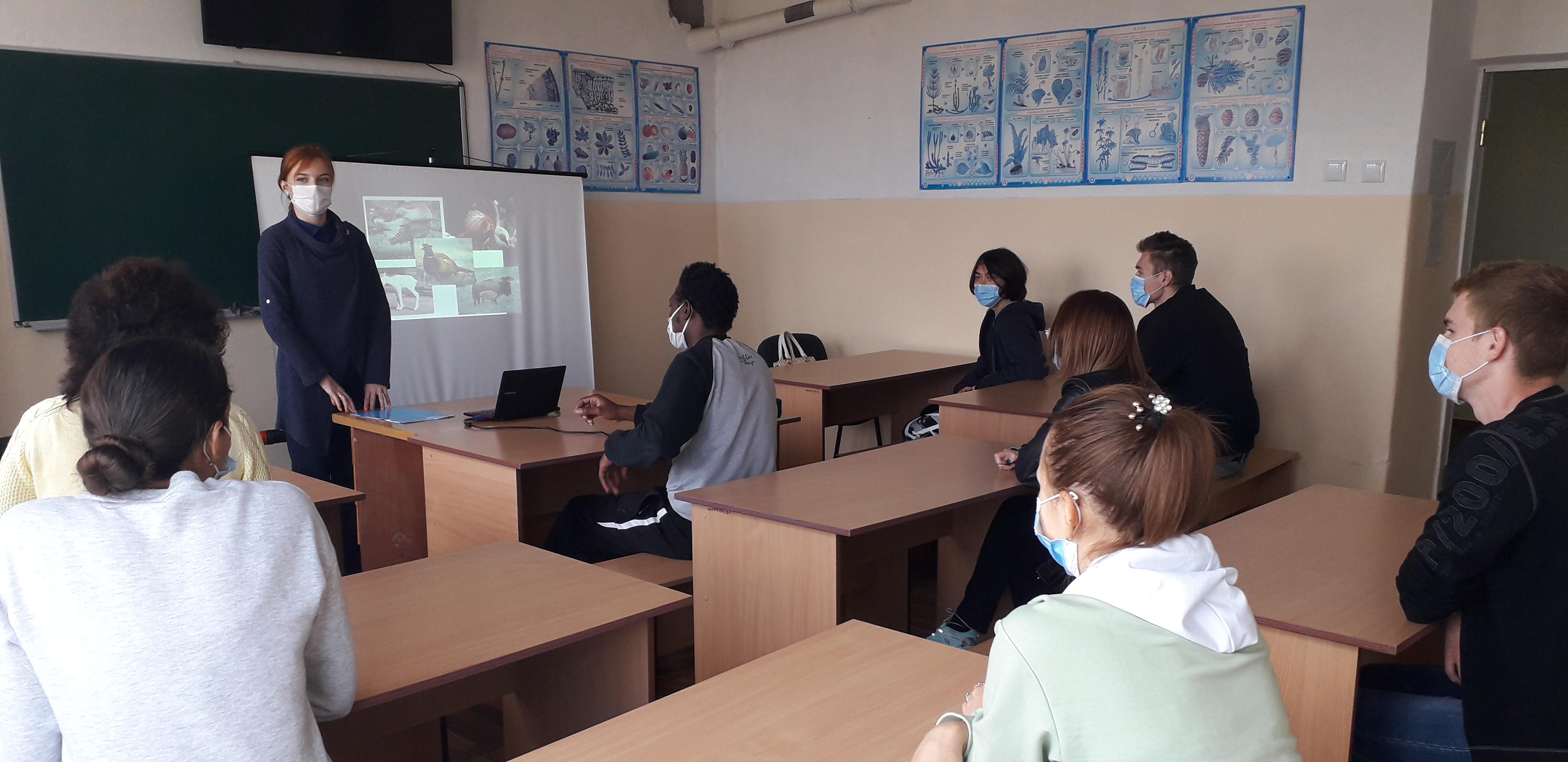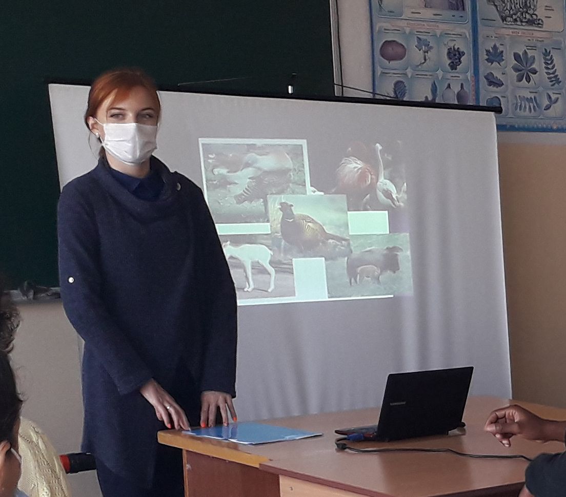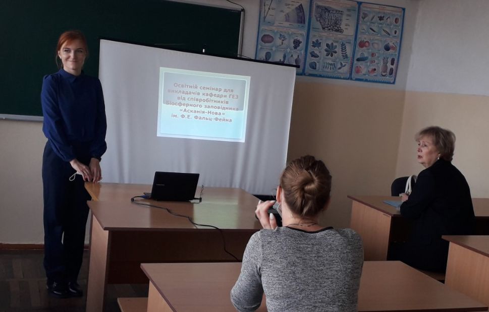 (Випускниця спеціальності, а наразі в.о. молодшого наукового співробітника лабораторії біомоніторингу і заповідного степу Біосферного заповідника “Асканія-Нова” імені Ф.Е. Фальц-Фейна НААН Старовойтова Тетяна Вікторівна проводить освітній семінар для викладачів кафедри та здобувачів освіти)