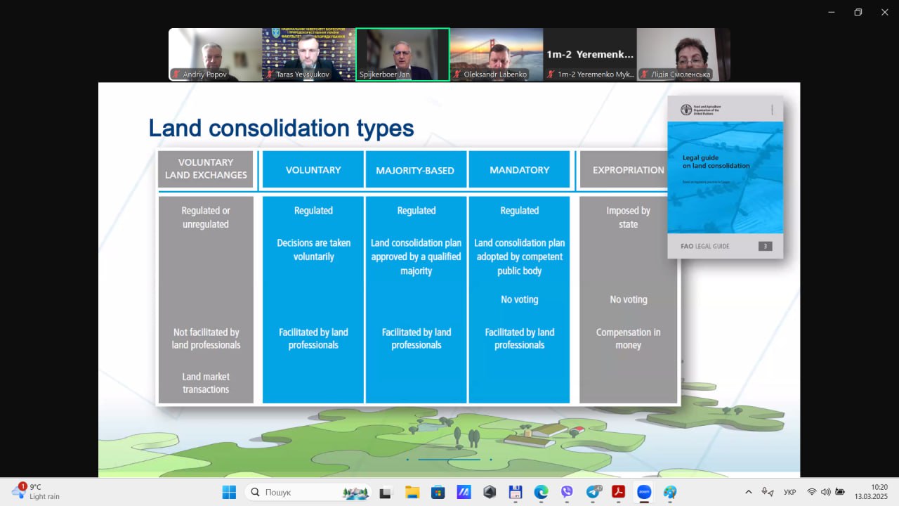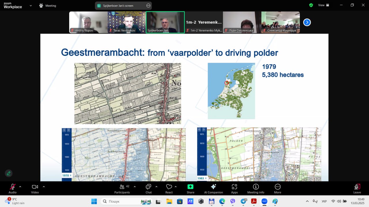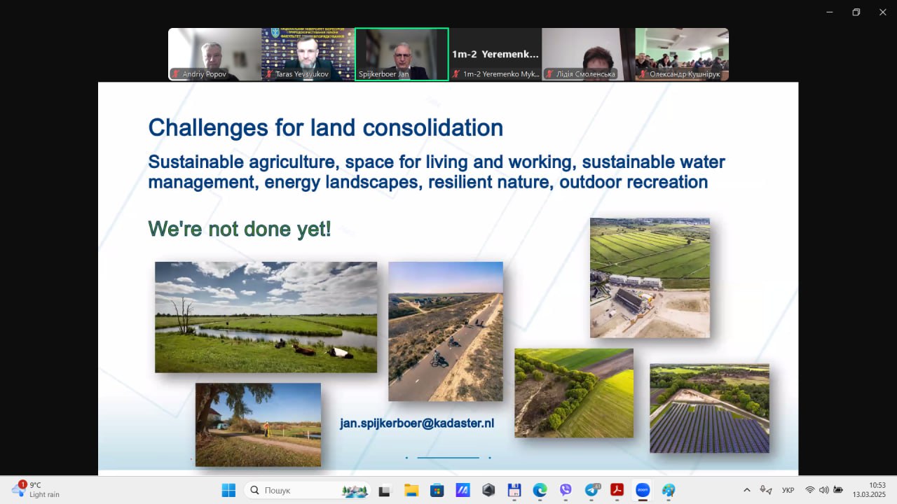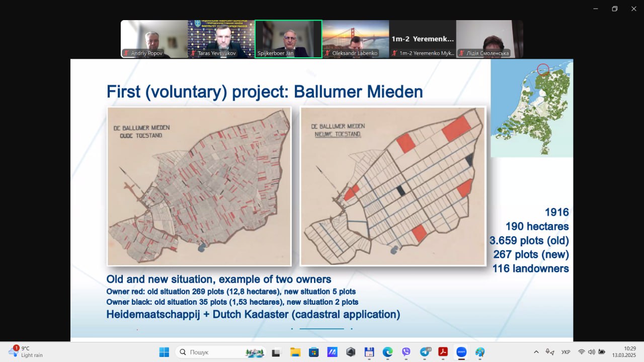 13 березня 2025 року здобувачі вищої освіти СВО “Бакалавр” і “Магістр” спеціальності 193 Геодезія та землеустрій факультету агротехнологій та екології разом з науково-педагогічними працівниками кафедри геоекології і землеустрою відвідали онлайн лекцію з вивчення досвіду консолідації земель у Нідерландах та провінції Зеландія.