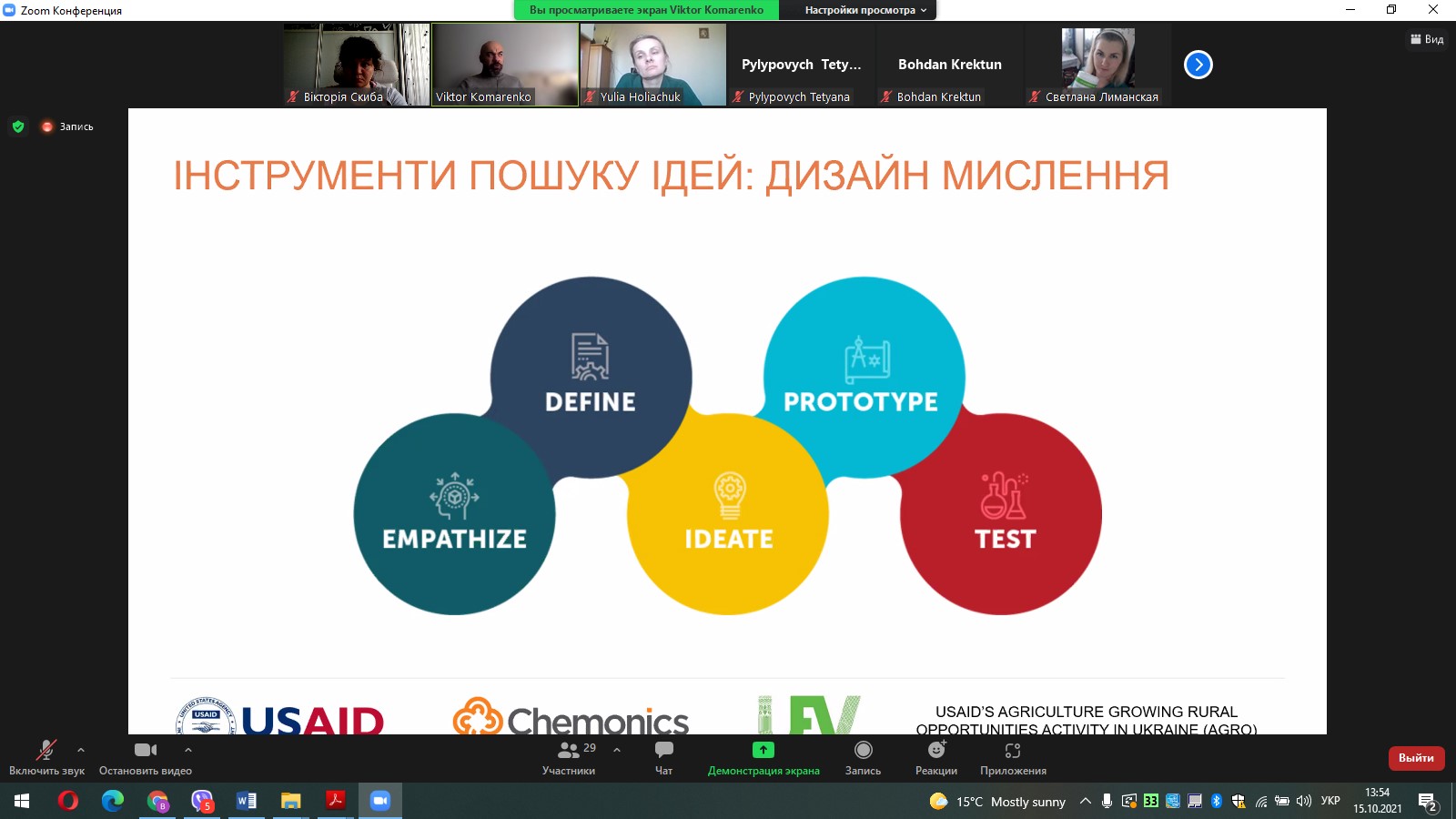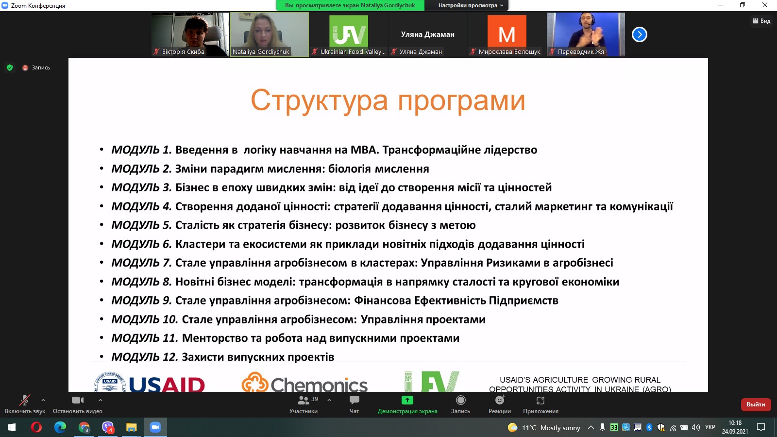 Троє науковців ТДАТУ долучились до річної програми навчання на програмі МІНІ-МВА від Ukrainian Food Valley, яка передбачає 180 годин тренінгів та практичних кейсів (10 навчальних модулів, 1 виїзний модуль на агропідприємство та захист індивідуального та групового проєктів). Добір учасників навчання відбувався шляхом конкурсного відбору та попередньої співбесіди, пільгові умови мала змогу отримати ст. викладач кафедри геоекології і землеустрою Вікторія Скиба