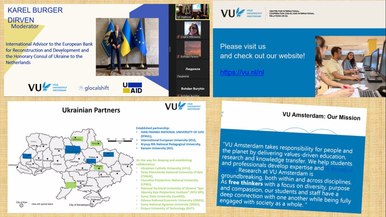 – Блок 3 «Досвід Нідерландів: рекомендації щодо освітньої стійкості та зростання». Nuffic, Vrije Universiteit Amsterdam, NHL Stenden (розробник курсу та викладач Тім Ансворт) заключне слово Карела Бургера Дірвена. Організатори: U AID STICHTING – група молодих українських професіоналів у Нідерландах, об’єднаних місією пом’якшити наслідки війни в Україні. Починаючи зі збору коштів та гуманітарної допомоги, а тепер реалізовуючи проекти для відновлення та розвитку освіти в Україні!