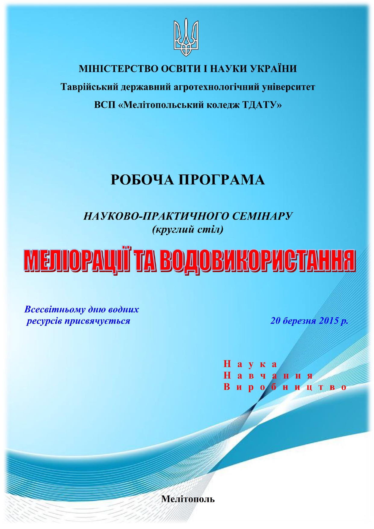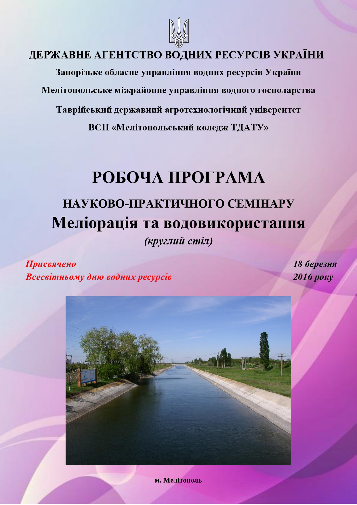 Робоча програма науково-практичного семінару (круглого столу) “Меліорація та водовикористання” присвяченого Всесвітньому дню водних ресурсів