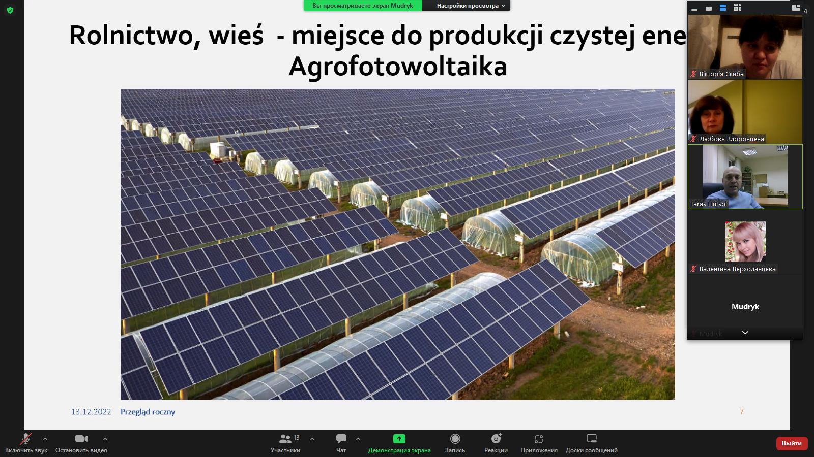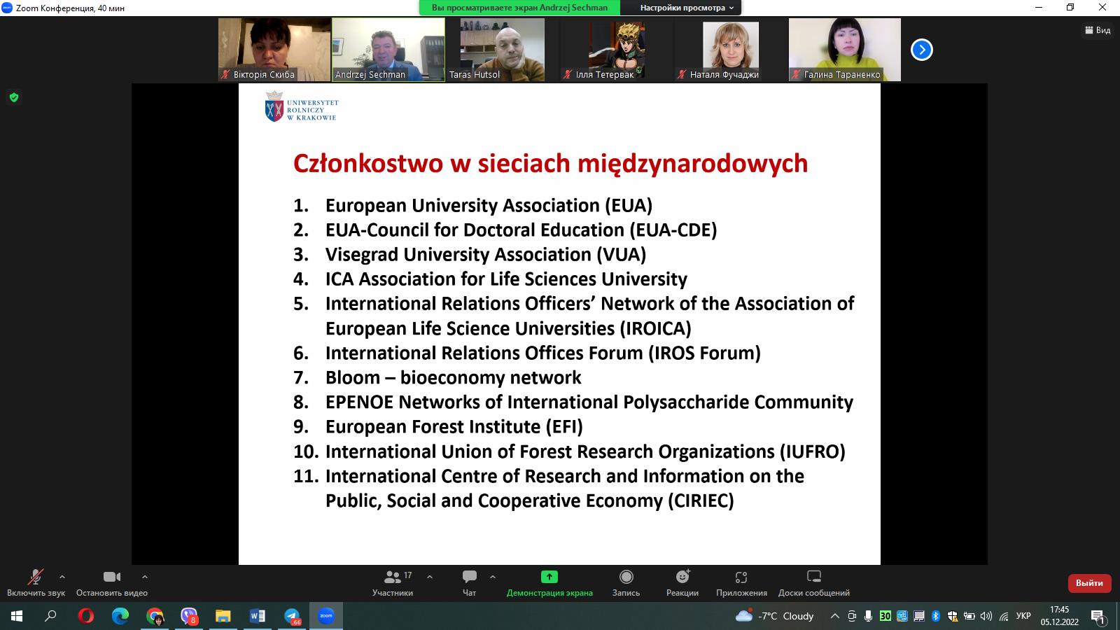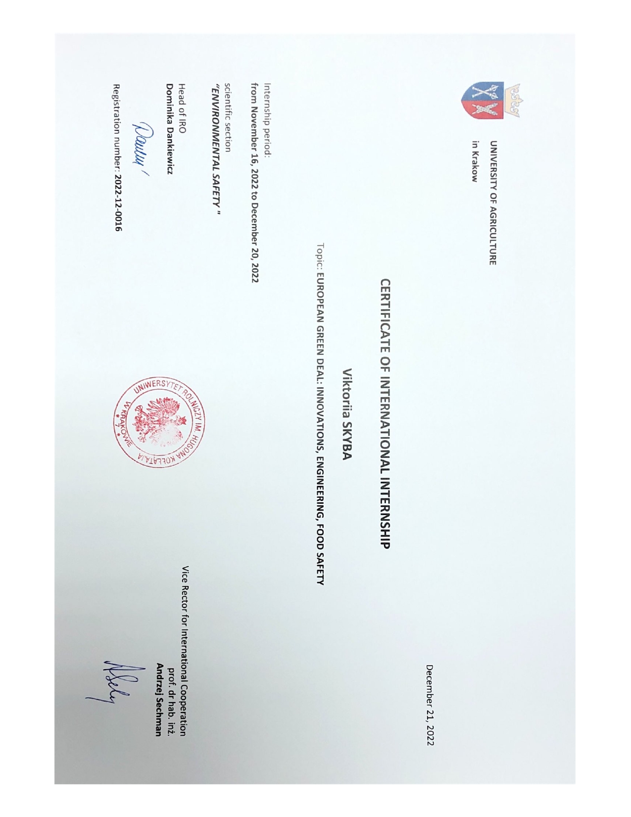 Наприкінці грудня 2022 року науково-педагогічні працівники ТДАТУ мали змогу долучитись до онлайн-стажування: «Еuropean green deal: innovations, engineering, food safety», яке проходило на базі University of agriculture in Krakow (Краків, Польща).
