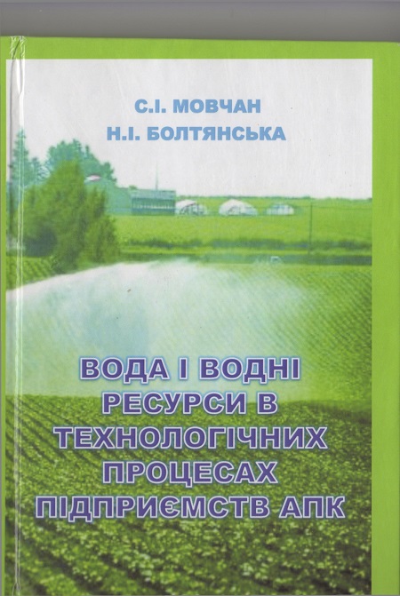 Мовчан С.І. Вода і водні ресурси в технологічних процесах підприємств АПК. Навчальний посібник /С.І. Мовчан, Н.І. Болтянська. – Мелітополь.– ВПЦ ТОВ «КолорПринт», 2019. – 190 с., іл. В навчальному посібнику наведена класифікація водних ресурсів, характеристика їх запасів і розподіл. Розглянуті види водоспоживання, основні споживачі води, їх особливості та вимоги. Викладені основи зрошувальних і осушувальних меліорацій, режим зрошення і техніка поливу сільськогосподарських культур, осушувальні і осушувально-зволожувальні меліорації, спеціальні види осушення. Навчальний посібник для студентів вищих навчальних закладів, наукових та інженерно-технічних працівників.