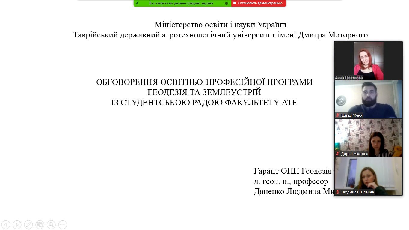 Студентською радою факультету агротехнологій та екології Таврійського агротехнологічного університету імені Дмитра Моторного було проведено обговорення проекту освітньо-професійної програми «Геодезія та землеустрій» для першого (бакалаврського) рівня вищої освіти. В обговорені прийняли участь гарант спеціальності 193 Геодезія та землеустрій Даценко Л.М., члени робочої групи (Мовчан С.І., Чебанова Ю.В., Лебедь Т.Р., Бражко С.В.) та члени студентської ради факультету АТЕ.