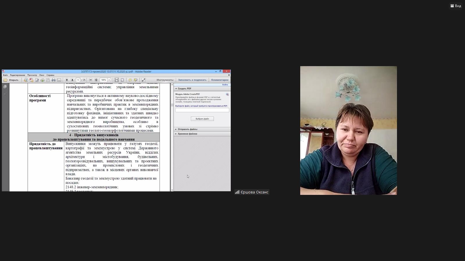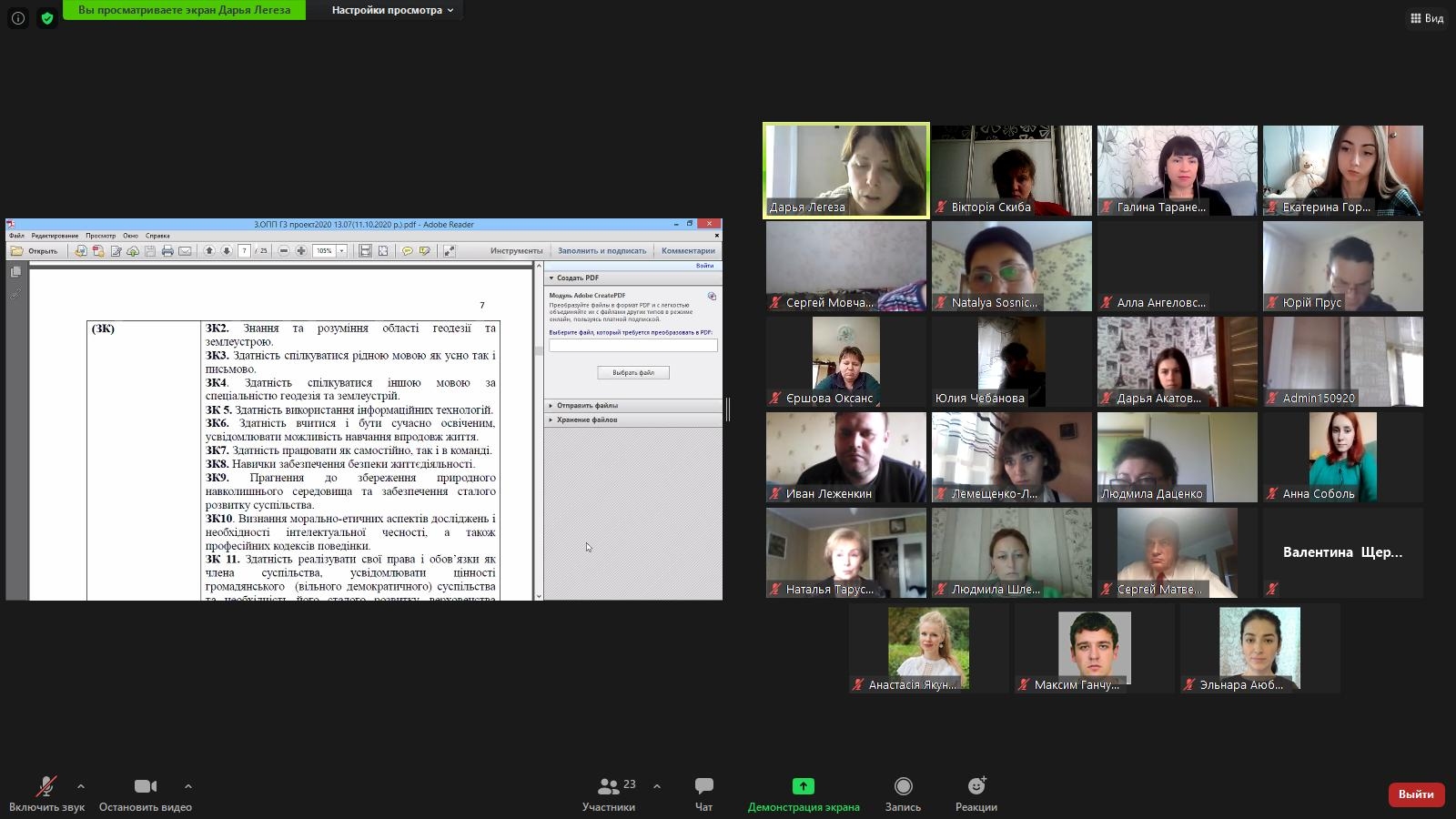 За ініціативи деканату факультету агротехнологій та екології та кафедри геоекології і землеустрою 14 жовтня 2020 року відбулася робоча нарада з діючим представником Національного агентства із забезпечення якості освіти Дарією Легезою. В форматі ZOOM-конференції були присутні представники кафедри геоекології і землеустрою, представники кафедр ТДАТУ, які забезпечують освітній процес та здобувачі вищої освіти спеціальності 193 «Геодезія та землеустрій».