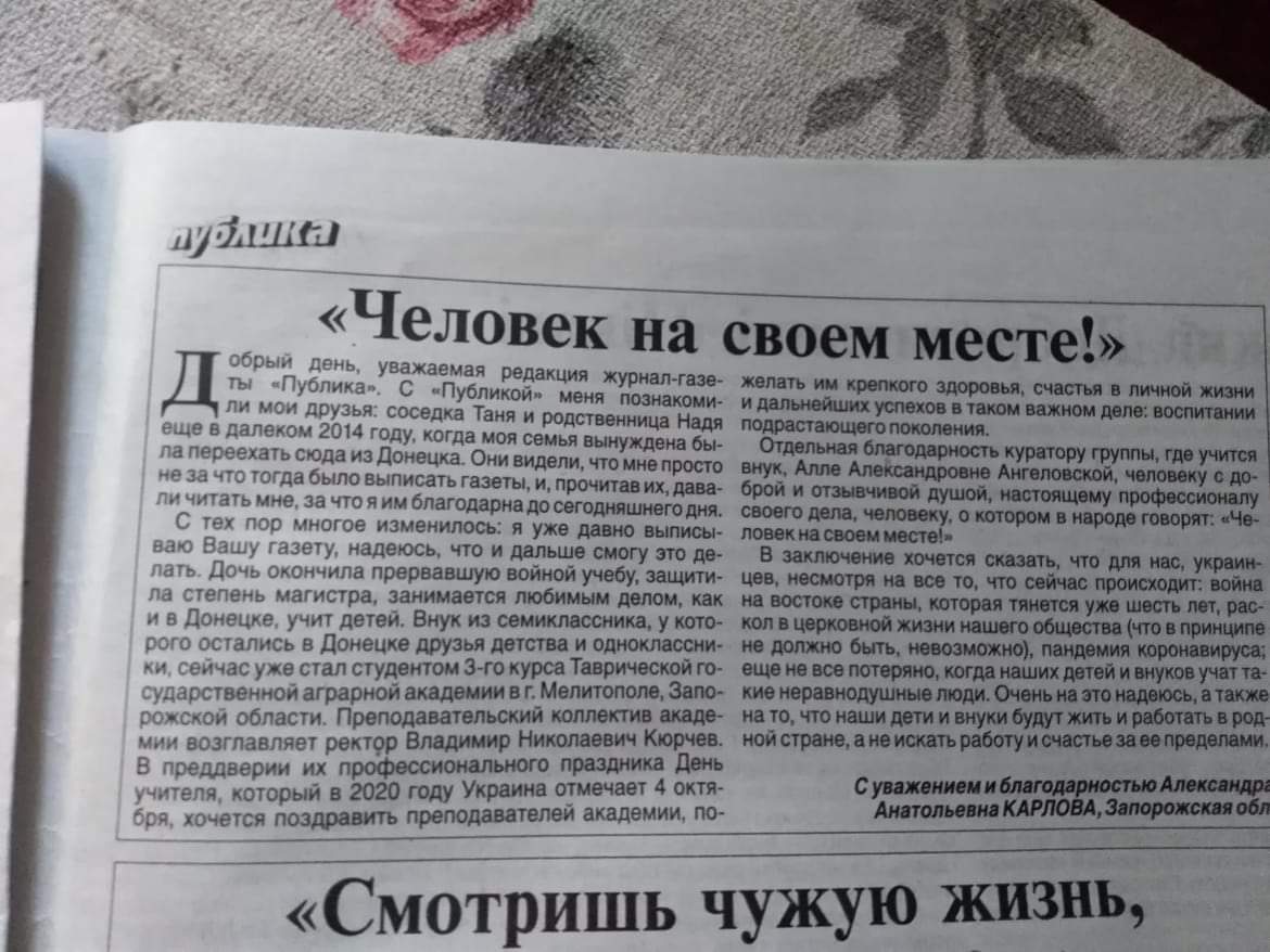 Так доброзичливе ставлення та не байдуже відношення куратора студентів 3-го курсу Алли Олександрівни знайшло відображення у публікації статті «Человек на своїм месте!» у періодичному виданні «Публіка». В якій Олександра Анатоліївна Карлова висловлює слова щирої вдячності ректору Таврійського державного агротехнологічного університету імені Дмитра Моторного, д.т.н., професору Кюрчеву Володимиру Миколайовичу та куратору групи Ангеловській Аллі Олександрівні.