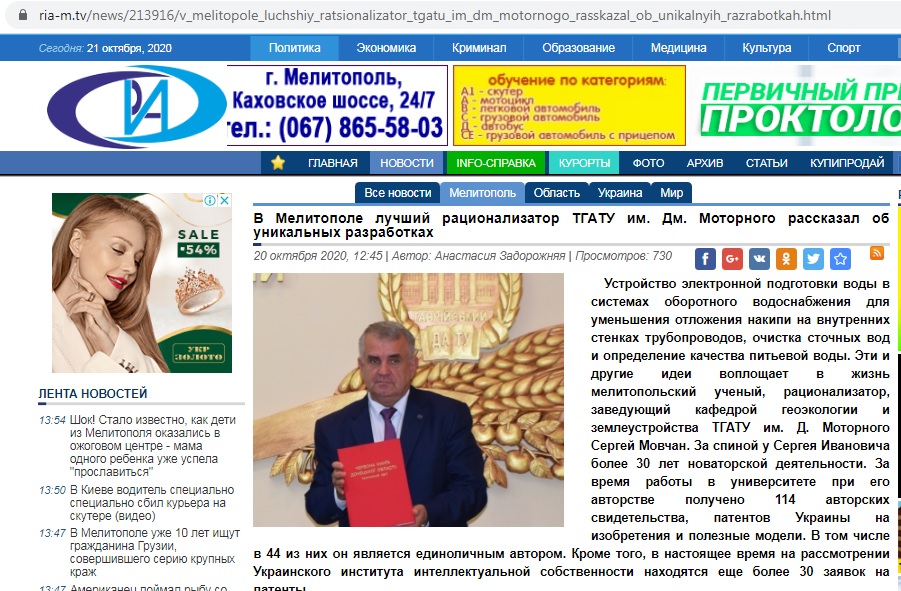 Про нас пишуть! Головний раціоналізатор ТДАТУ Сергій Мовчан розповідає про свої винаходи, новації та коло співпраці 21.10.2020 Раціоналізатор ТДАТУ Сергій Мовчан розповів про унікальні розробки ПУБЛІКАЦІЯ на сайті новин “РИА – МЕЛИТОПОЛЬ” У МЕЛІТОПОЛІ КРАЩИЙ РАЦІОНАЛІЗАТОР ТДАТУ ІМ. ДМ. МОТОРНОГО РОЗПОВІВ ПРО УНІКАЛЬНІ РОЗРОБКИ