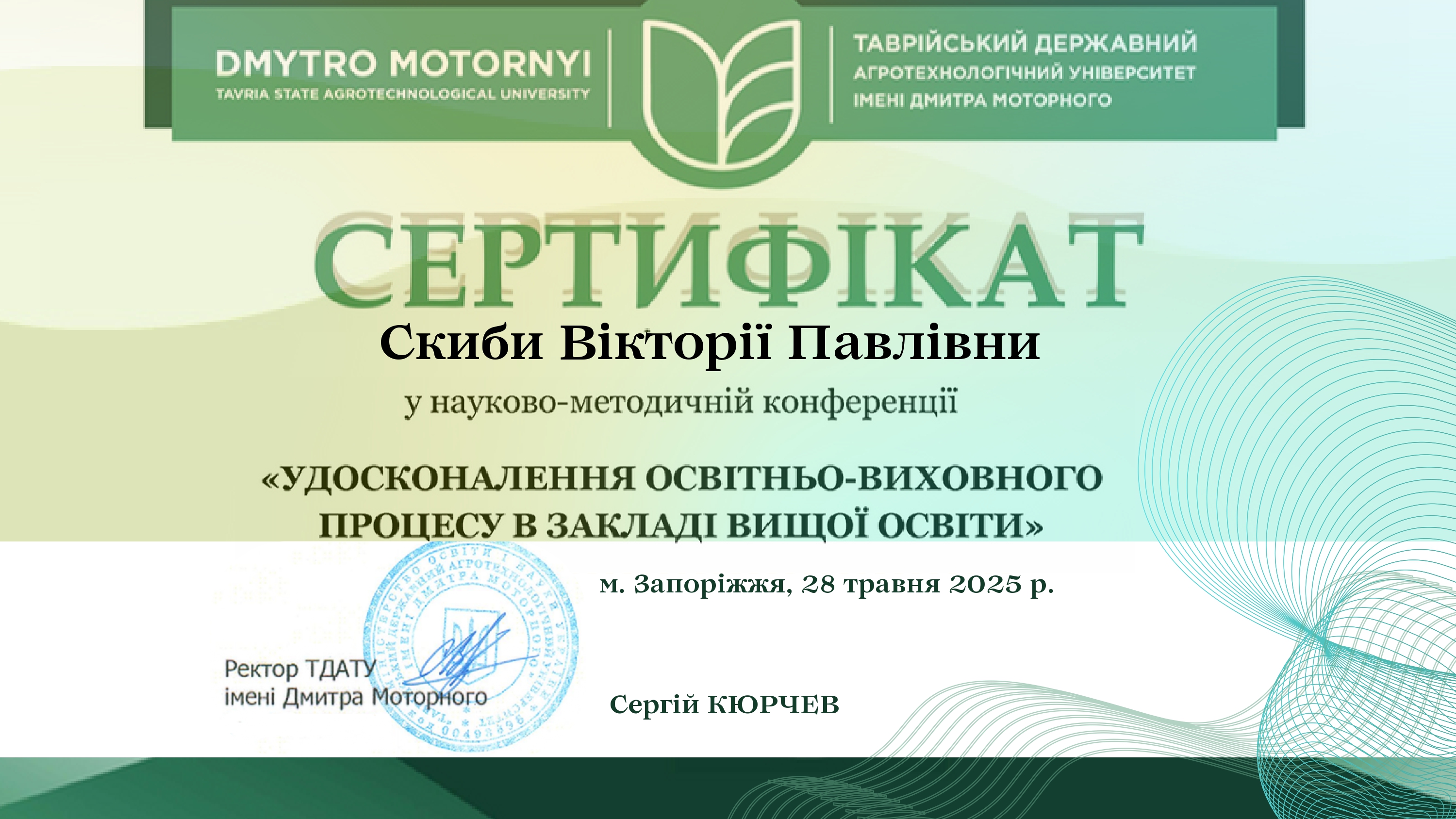 | 28 травня 2025 р. | Запоріжжя, Україна | Удосконалення освітньо-виховного процесу в закладі вищої освіти | Таврійський державний агротехнологічний університет ім. Дмитра Моторного | ![]() |