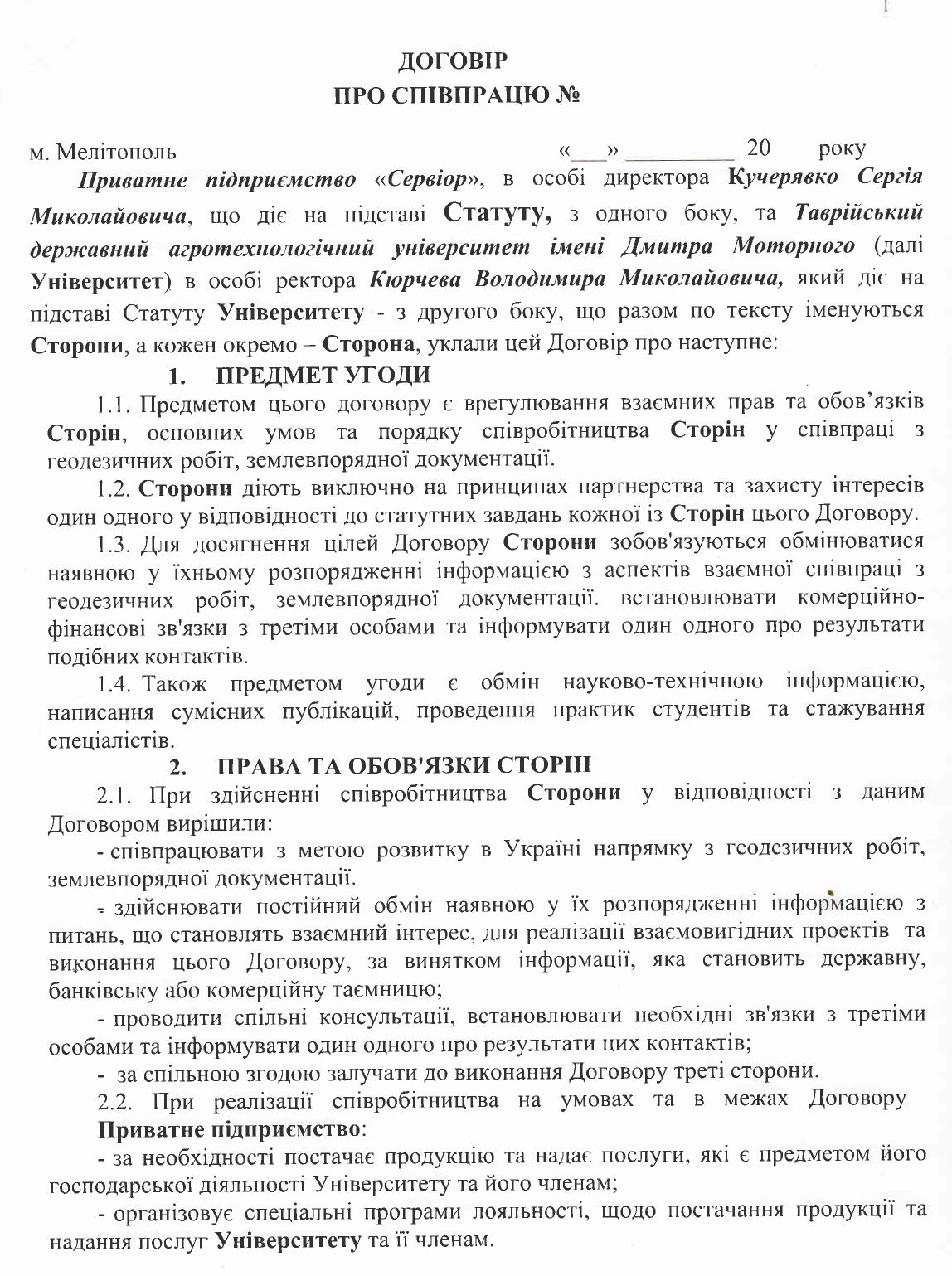 Заключено договір про співпрацю між кафедрою геоекології і землеустрою Таврійського державного агротехнологічного університету (ТДАТУ) та приватним підприємством “Сервіор” – однгим із провідних підприємств, не лише на теренах м. Мелітополь та Мелітопольського району, а й Запорізькій області.