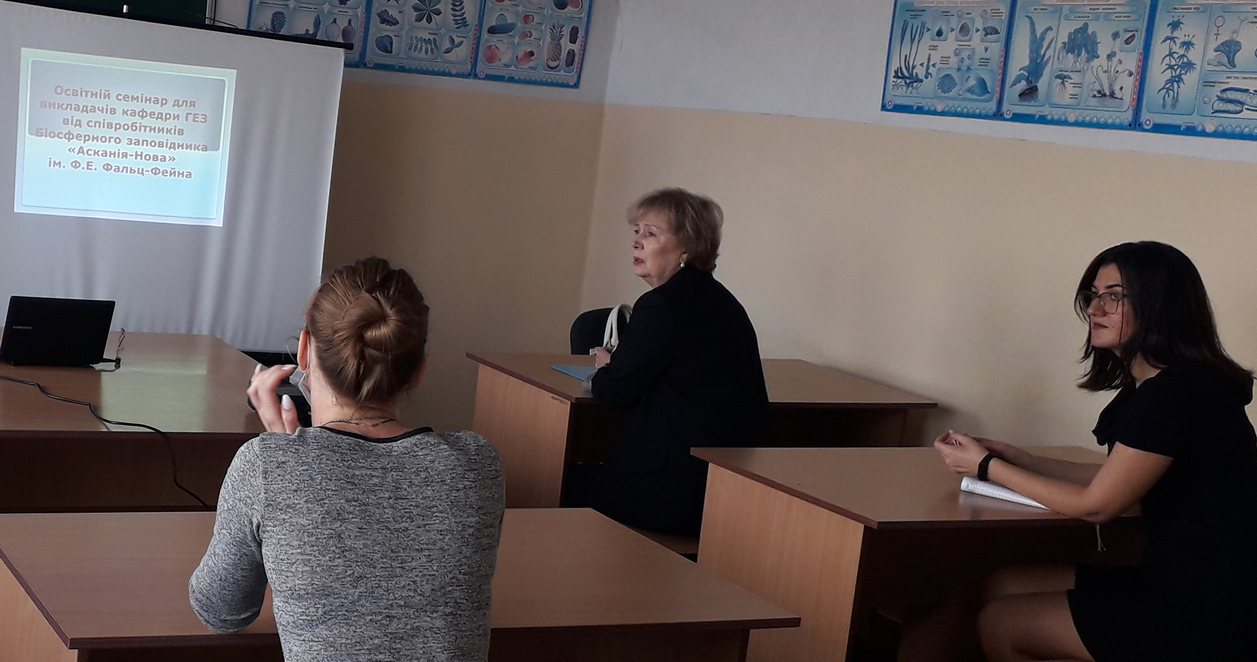 Другий захід був проведений у форматі відкритого освітнього семінару для викладачів кафедри ГЕЗ із запрошенням випускниці спеціальності, а наразі в.о. молодшого наукового співробітника лабораторії біомоніторингу і заповідного степу Біосферного заповідника “Асканія-Нова” імені Ф.Е. Фальц-Фейна НААН Старовойтової Тетяни Вікторівни. В ході семінару доповідач визначив новітні підходи в галузі моніторингу довкілля та поділився власними напрацюваннями за матеріалами дисертації на здобуття ступеня кандидата біологічних наук над якою наразі працює.