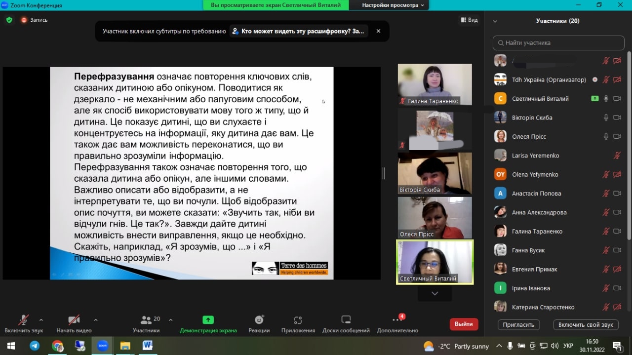 Незважаючи на усі технічні складнощі сьогодення тьюторам вдалось плідно передавати авдиторії неймовірно корисний матеріал, сформувати вкрай необхідні навички надання ППД, навчити методикам опанування власним станом тривожності та надати дуже цінні поради спілкування з постраждалими, які мають різнопланові психологічні травми, спричинені жорсткою воєнною агресією проти нашого народу.