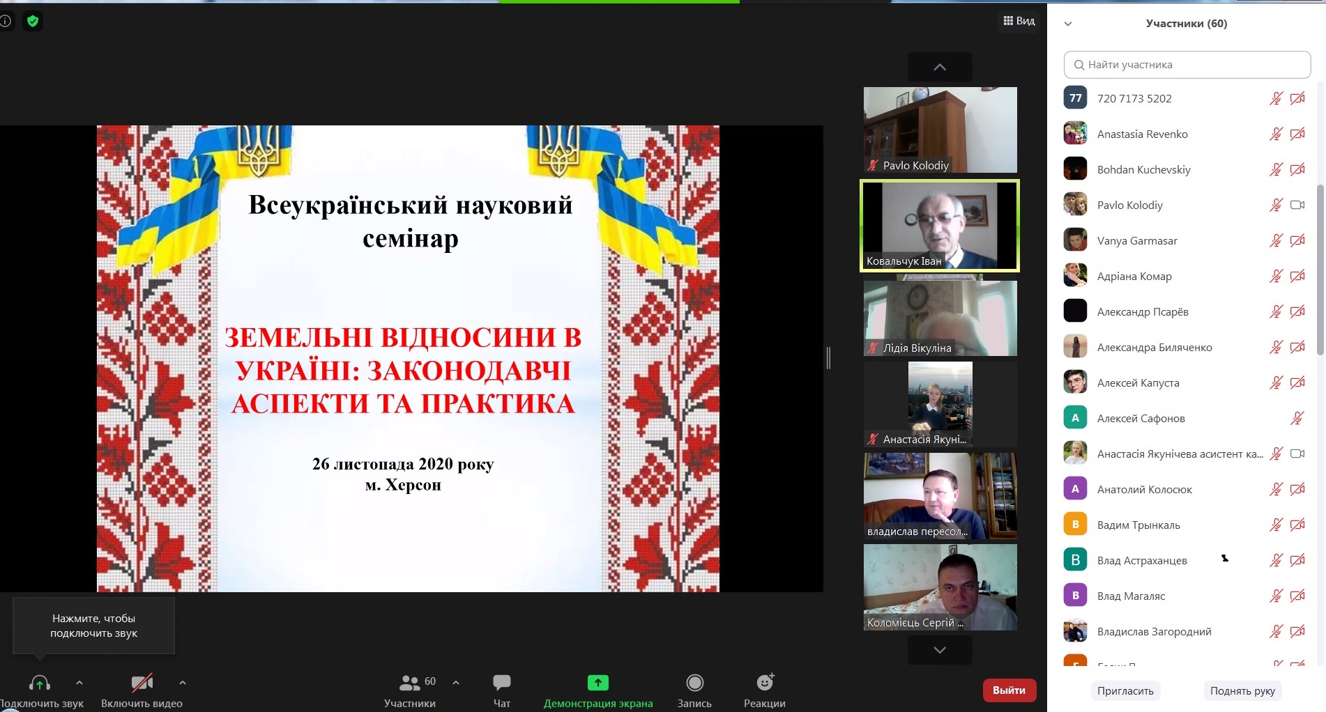 26 листопада 2020 року викладачі кафедри геоекології і землеустрою,  в.о. завідувача кафедри, к.т.н., доц.  Сергій Мовчан, к.т.н., доц. Сергій Коломієць, к.е.н., доц. Юрій Прус, к.т.н, ст. викл. Іван Леженкін, ст. викл. Максим Ганчук, к.е.н., ас. Анастасія Якунічева, ас. Ельнара Аюбова, ас. Вікторія Скиба долучились до обговорення сучасного стану земельних відносин у рамках “Всеукраїнського наукового семінару Земельні відносини в Україні: законодавчі аспекти та практика”, що проводила за допомогою платформи Zoom, кафедра землеустрою, геодезії та кадастру ДВНЗ “Херсонський державний аграрний університет”.