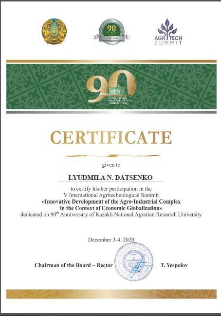 З нагоди ювілейної дати 90-річчя Казахського національного аграрного дослідницького університету 3-4 грудня 2020 року в м. Алмати проведено V Міжнародний Агротехнологічний Саміт «Инновационное развитие АПК в условиях глобализации экономики» (рос. мовою). В якому прийняло участь 223 спікера з 54 країн світу США, Європи і Азіатсько-Тихоокеанського регіону.