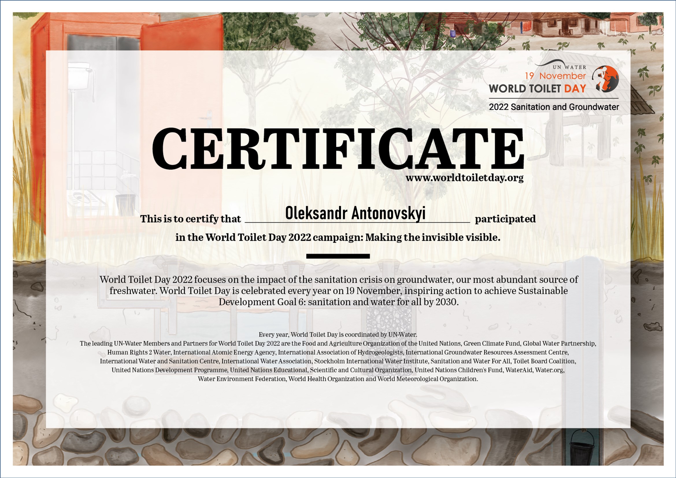 Усі з дитинства чули фразу про колообіг води у природі! Логічним продовженням цьогорічної тематики Всесвітнього дня води 2022 року «Ґрунтові води: роблячи непомітне помітним» (ДЕНЬ ВОДИ 2022 РОКУ – РЕСУРС, ЯКИЙ НЕ МАЄ КОРДОНІВ! ), яка ініціюється ООН є відзначення WORLD TOILET DAY 2022. Цей день відзначається щорічно 19 листопада з 2013 року за ініціативи ООН.