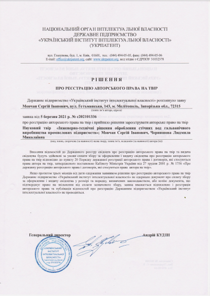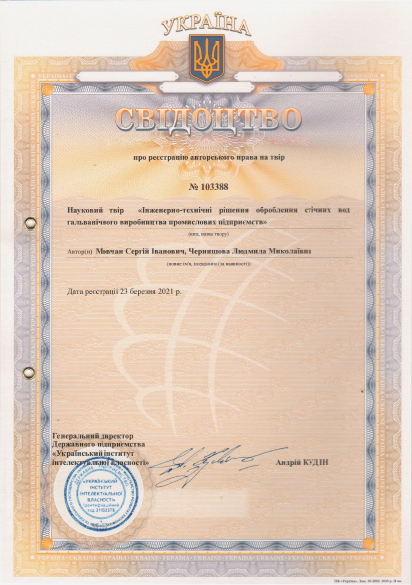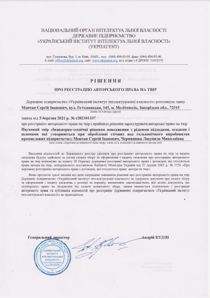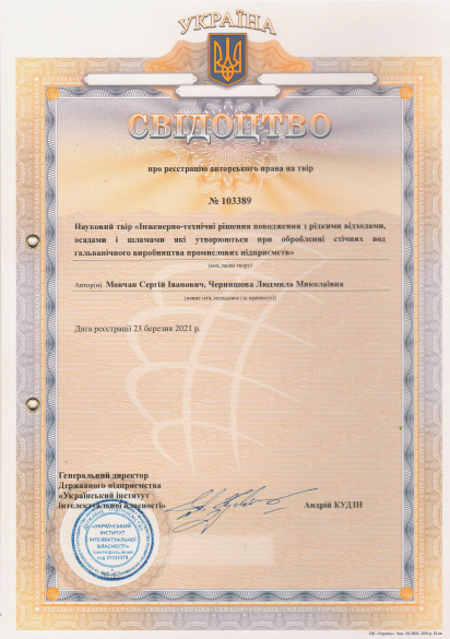 - Мовчан С.І. Свідоцтво про реєстрацію авторського права на твір №103389. Дата реєстрації 23 березня 2021 р. Науковий твір «Інженерно-технічне рішення поводження з рідкими відходами, осадами і шламами які утворюються при обробленні стічних вод гальванічного виробництва» / С.І.Мовчан, Л.М. Чернишова // Ідентифікатор: СR0555230321. https://sis.ukrpatent.org