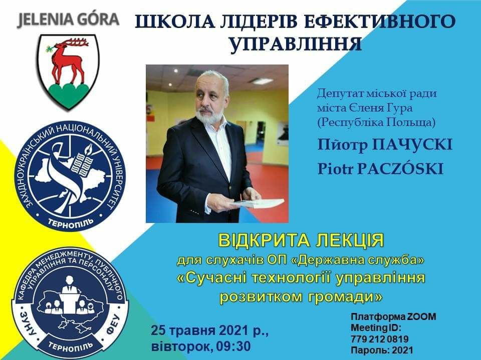 В рамках проходження практики здобувачі вищої освіти 1, 2 та 3 курсів спеціальності “Публічне управління та адміністрування” ТДАТУ імені Дмитра Моторного долучилися до відкритої лекції Школи лідерів ефективного управління, провідним доповідачем якої був депутат міської ради міста Єленя Гура Пйотр Пачускі.