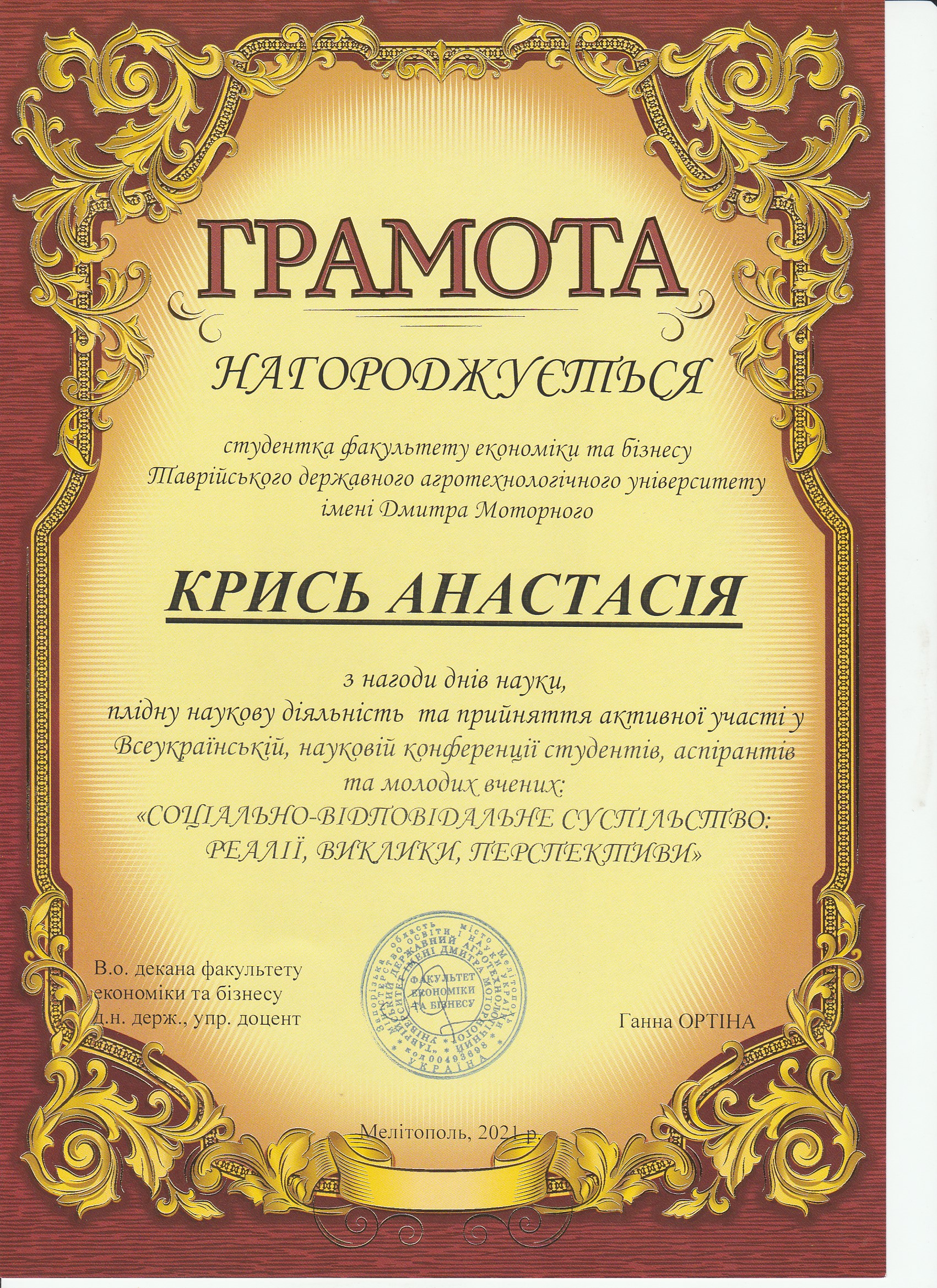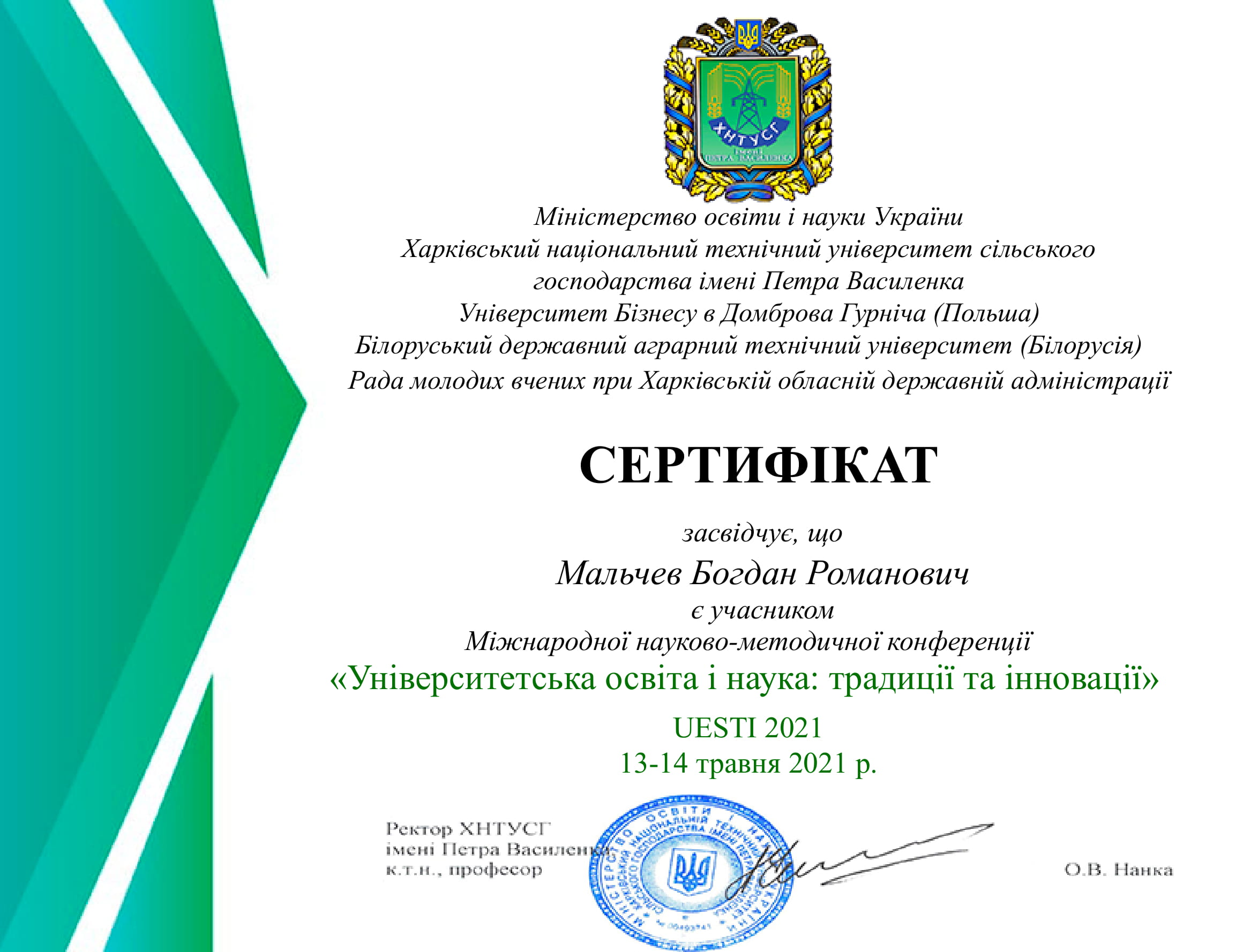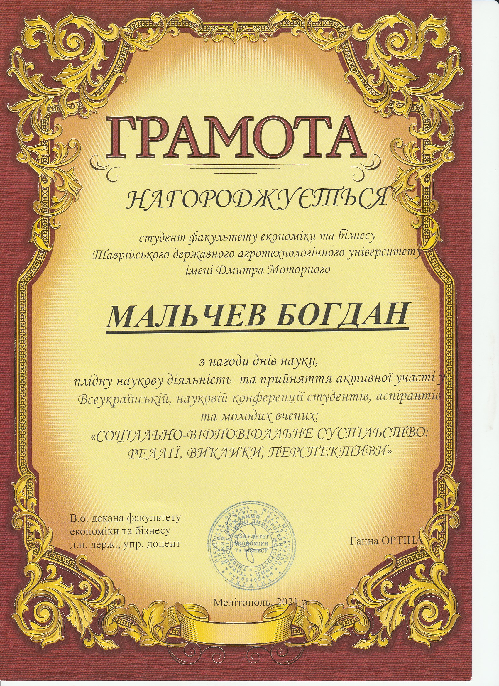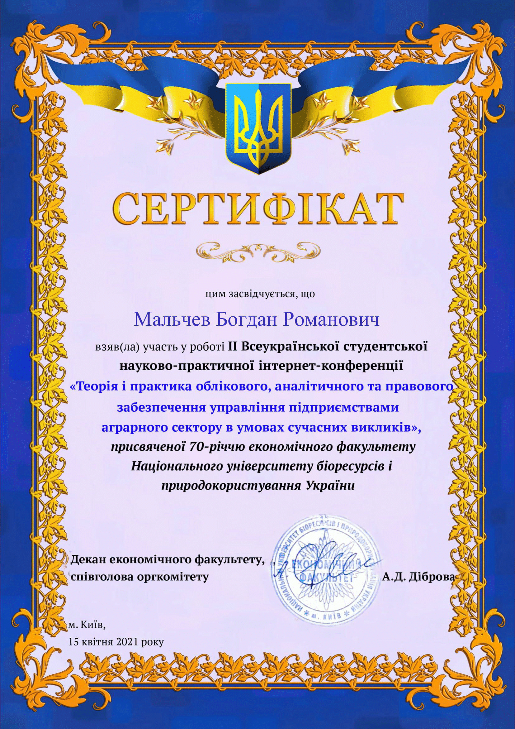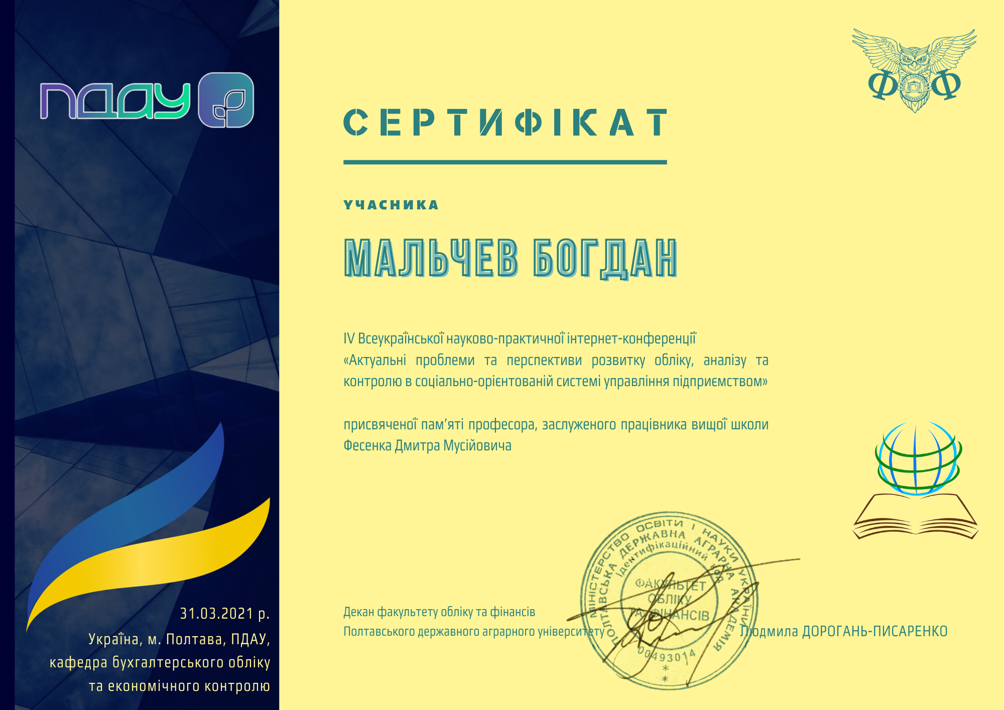 За результатами роботи наукового гуртка студент групи 11 ПУ Мальчев Богдан долучився до IV Всеукраїнської науково-практичної конференції “Актуальні проблеми та перспективи розвитку обліку, аналізу та контролю в соціально-орієнтованій системі управління підприємством”.